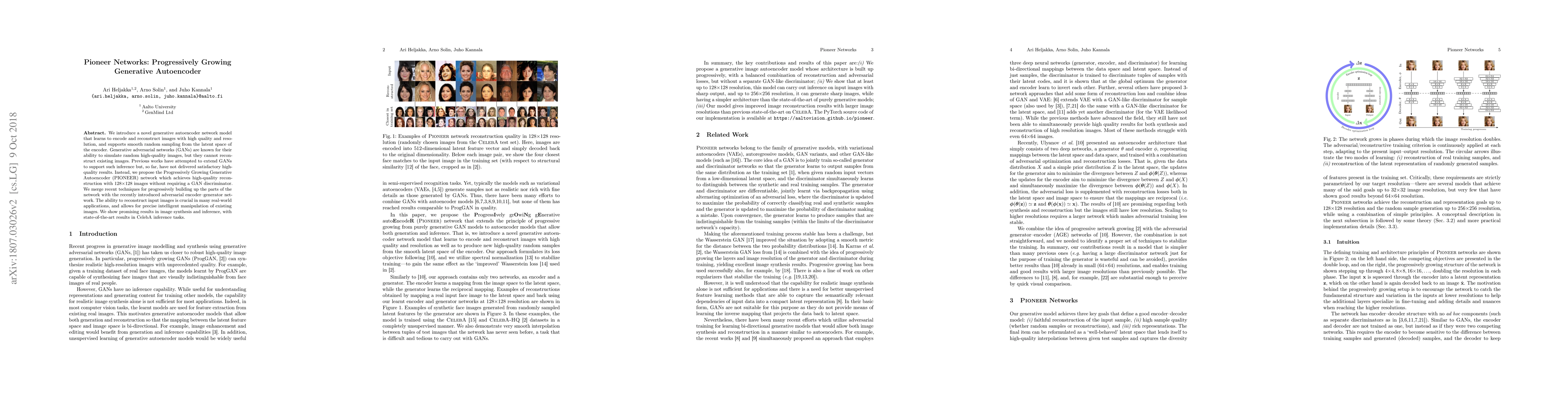 We introduce a novel generative autoencoder network model that learns to encode and reconstruct images with high quality and resolution, and supports smooth random sampling from the latent space of the encoder. Generative adversarial networks (GANs) are known for their ability to simulate random high-quality images, but they cannot reconstruct existing images. Previous works have attempted to extend GANs to support such inference but, so far, have not delivered satisfactory high-quality results. Instead, we propose the Progressively Growing Generative Autoencoder (PIONEER) network which achieves high-quality reconstruction with $128{\times}128$ images without requiring a GAN discriminator. We merge recent techniques for progressively building up the parts of the network with the recently introduced adversarial encoder-generator network. The ability to reconstruct input images is crucial in many real-world applications, and allows for precise intelligent manipulation of existing images. We show promising results in image synthesis and inference, with state-of-the-art results in CelebA inference tasks.
