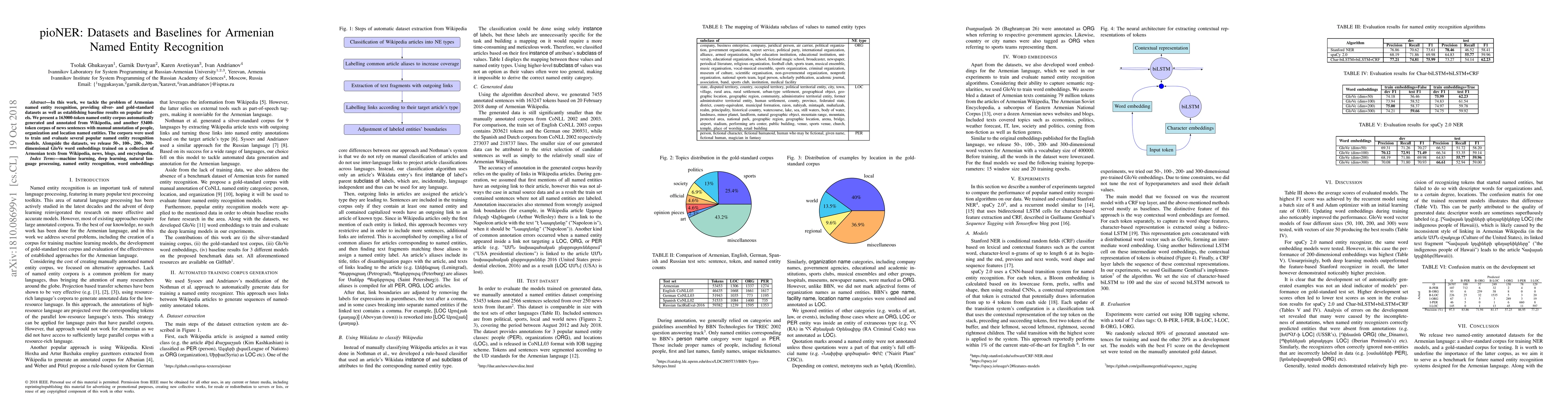 In this work, we tackle the problem of Armenian named entity recognition, providing silver- and gold-standard datasets as well as establishing baseline results on popular models. We present a 163000-token named entity corpus automatically generated and annotated from Wikipedia, and another 53400-token corpus of news sentences with manual annotation of people, organization and location named entities. The corpora were used to train and evaluate several popular named entity recognition models. Alongside the datasets, we release 50-, 100-, 200-, 300-dimensional GloVe word embeddings trained on a collection of Armenian texts from Wikipedia, news, blogs, and encyclopedia.