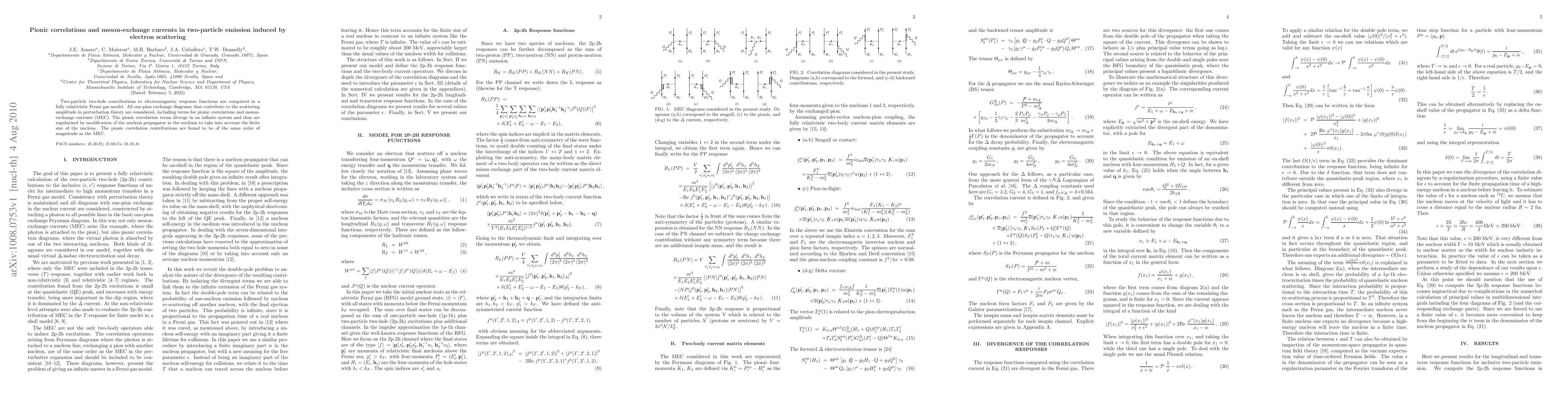This paper computes two-particle two-hole contributions to electromagnetic response functions in a relativistic Fermi gas model, focusing on one-pion exchange diagrams and their effects, including pionic correlations and meson-exchange currents. Pionic correlations are regularized by modifying the nucleon propagator to account for nuclear finite size, revealing comparable magnitudes to meson-exchange currents.