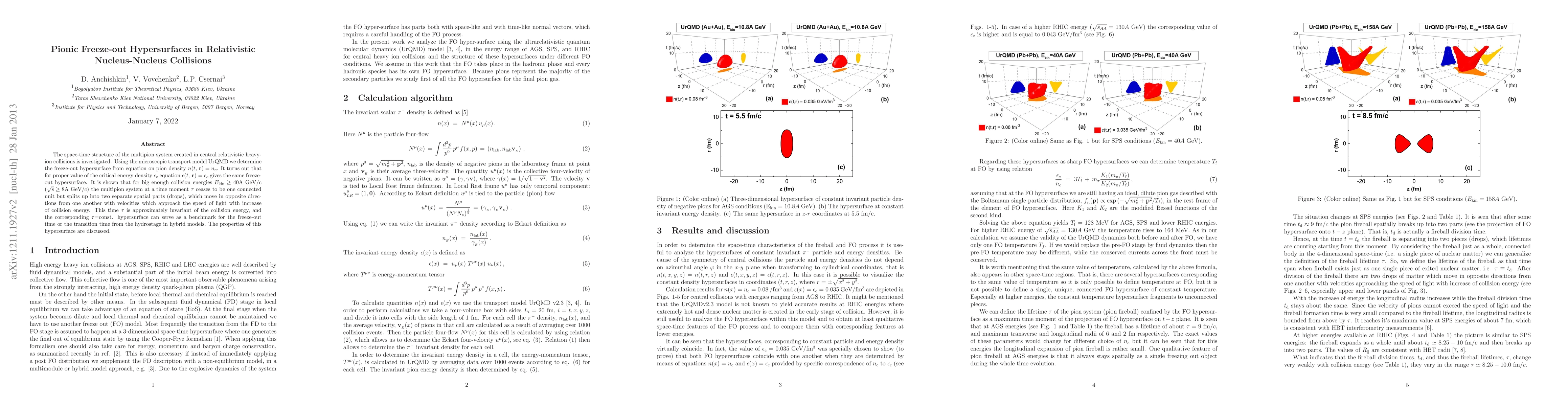 The space-time structure of the multipion system created in central relativistic heavy-ion collisions is investigated. Using the microscopic transport model UrQMD we determine the freeze-out hypersurface from equation on pion density n(t,r)=n_c. It turns out that for proper value of the critical energy density \epsilon_c equation \epsilon(t,r)=\epsilon_c gives the same freeze-out hypersurface. It is shown that for big enough collision energies E_kin > 40A GeV/c (sqrt(s) > 8A GeV/c) the multipion system at a time moment {\tau} ceases to be one connected unit but splits up into two separate spatial parts (drops), which move in opposite directions from one another with velocities which approach the speed of light with increase of collision energy. This time {\tau} is approximately invariant of the collision energy, and the corresponding \tau=const. hypersurface can serve as a benchmark for the freeze-out time or the transition time from the hydrostage in hybrid models. The properties of this hypersurface are discussed.