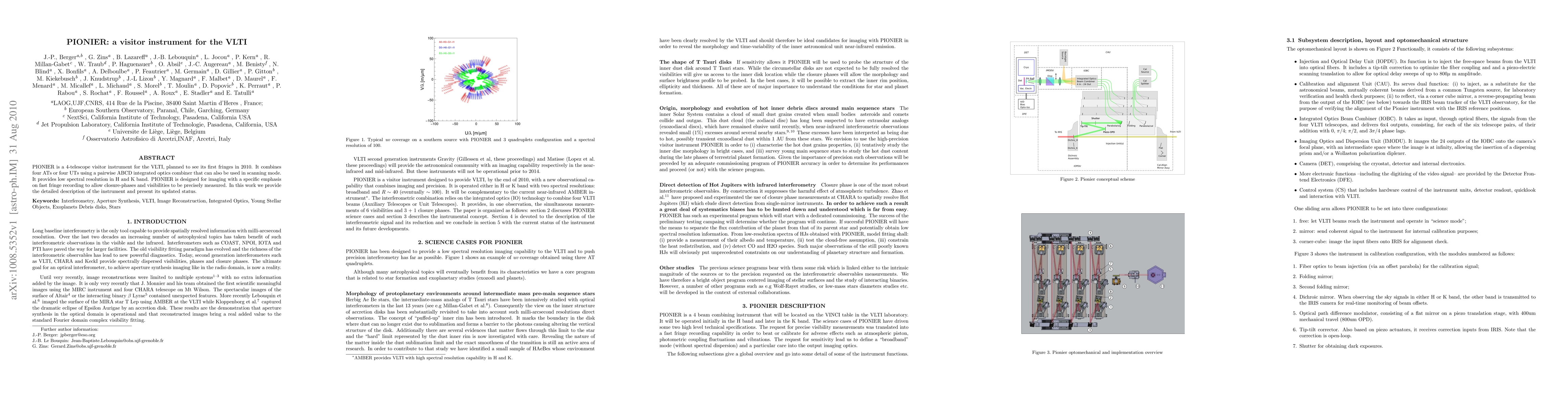 PIONIER is a visitor instrument for the VLTI, combining four telescopes for interferometric imaging in the H and K bands. It aims to achieve precise measurements of closure-phases and visibilities, with its first fringes expected in 2010.