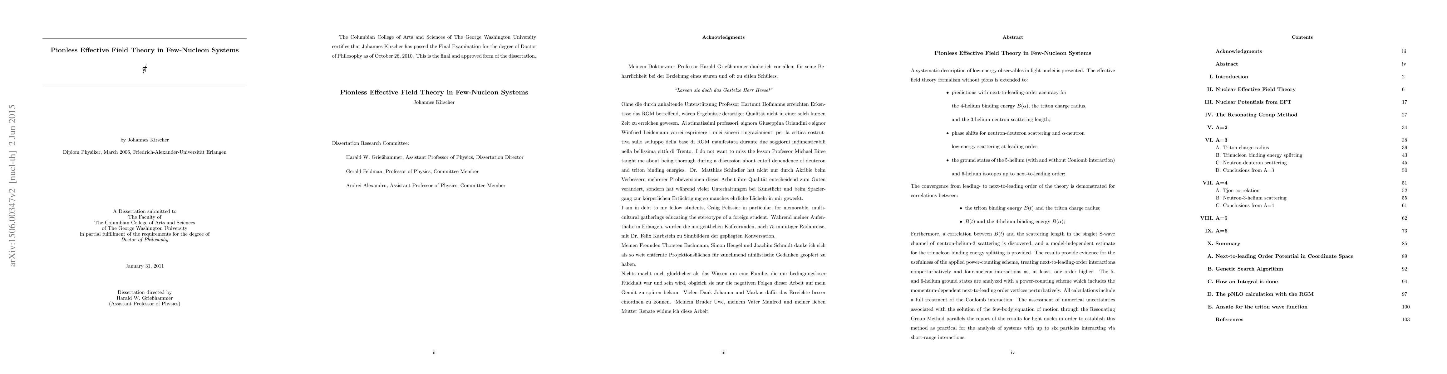A systematic description of low-energy observables in light nuclei is presented. The effective field theory formalism without pions is extended to: i) predictions with next-to-leading-order (non-perturbatively) accuracy for the 4-helium binding energy B({\alpha}), the triton charge radius, and the 3-helium-neutron scattering length; ii) phase shifts for neutron-deuteron scattering and {\alpha}-neutron low-energy scattering at leading order; iii) the ground states of the 5-helium (with and without Coulomb interaction) and 6-helium isotopes up to next-to-leading order; The convergence from leading- to next-to-leading order of the theory is demonstrated for correlations between: i) the triton binding energy B(t) and the triton charge radius; ii) B(t) and the 4-helium binding energy B({\alpha}); Furthermore, a correlation between B(t) and the scattering length in the singlet S-wave channel of neutron-helium-3 scattering is discovered, and a model-independent estimate for the trinucleon binding energy splitting is provided. The results provide evidence for the usefulness of the applied power-counting scheme, treating next-to-leading-order interactions nonperturbatively and four-nucleon interactions as, at least, one order higher. The 5- and 6-helium ground states are analyzed with a power-counting scheme which includes the momentum-dependent next-to-leading order vertices perturbatively. All calculations include a full treatment of the Coulomb interaction. The assessment of numerical uncertainties associated with the solution of the few-body equation of motion through the Resonating Group Method parallels the report of the results for light nuclei in order to establish this method as practical for the analysis of systems with up to six particles interacting via short-range interactions.