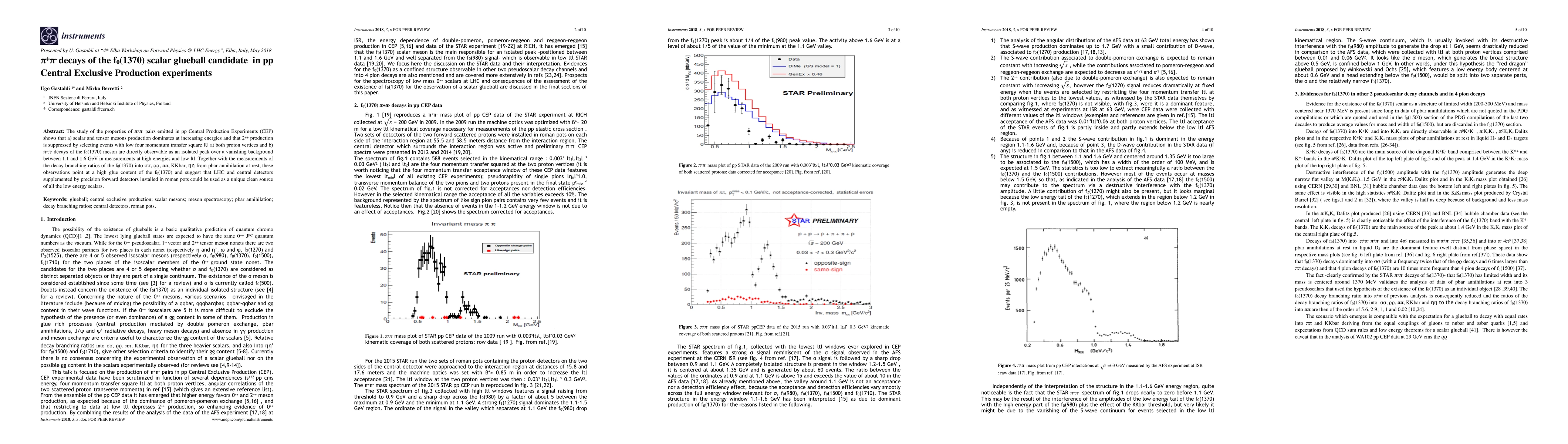 The study of the properties of pion pairs emitted in pp Central Production Experiments (CEP) shows that a) scalar and tensor mesons production dominates at increasing energies and that 2++ production is suppressed by selecting events with low four momentum transfer square -t at both proton vertices and b) pion+pion- decays of the f0(1370) meson are directly observable as an isolated peak over a vanishing background between 1.1 and 1.6 GeV in measurements at high energies and low -t. Together with the measurements of the decay branching ratios of the f0(1370) into sigma sigma, rho rho, pion pion, Kaon antiKaon, eta eta from pbar annihilation at rest, these observations point at a high glue content of the f0(1370) and suggest that LHC and central detectors supplemented by precision forward detectors installed in roman pots could be used as a unique clean source of all the low energy scalars.