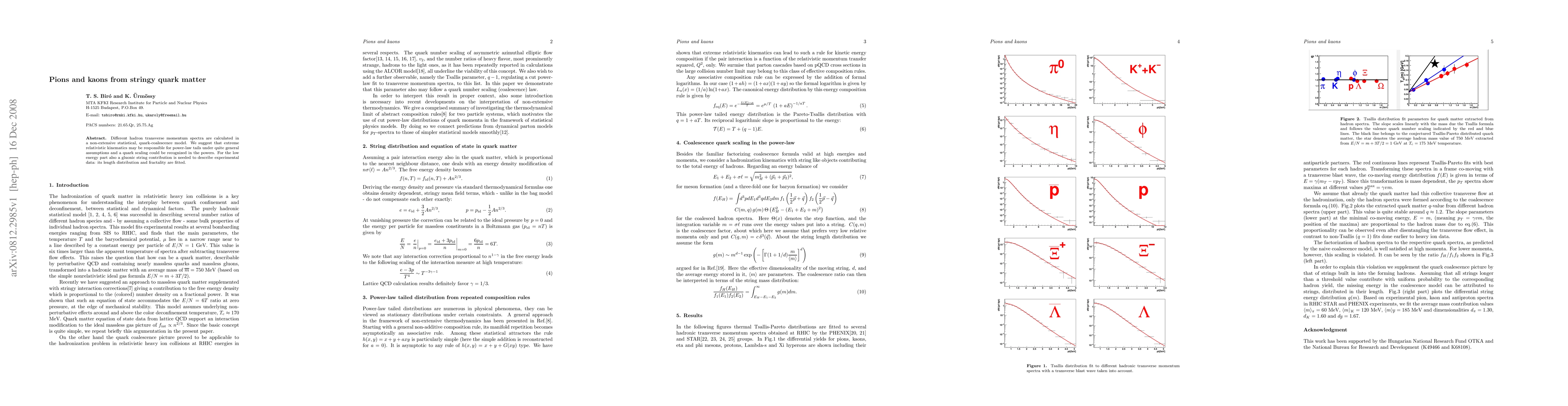 Different hadron transverse momentum spectra are calculated in a non-extensive statistical, quark-coalescence model. For the low-pT part a gluonic string contribution is conjectured, its length distribution and fractality are fitted to RHIC data.