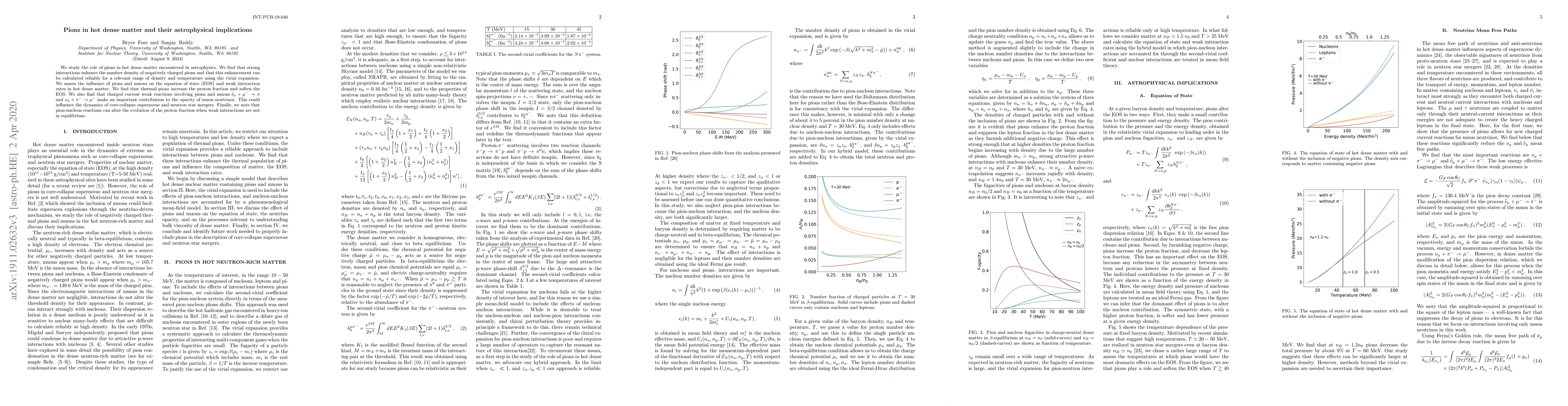 This paper investigates the impact of pions in hot dense astrophysical environments, finding that strong interactions increase the density of negatively charged pions. The study reveals that pions and muons affect the equation of state and weak interaction rates, potentially influencing the dynamics of core-collapse supernovae and neutron star mergers.