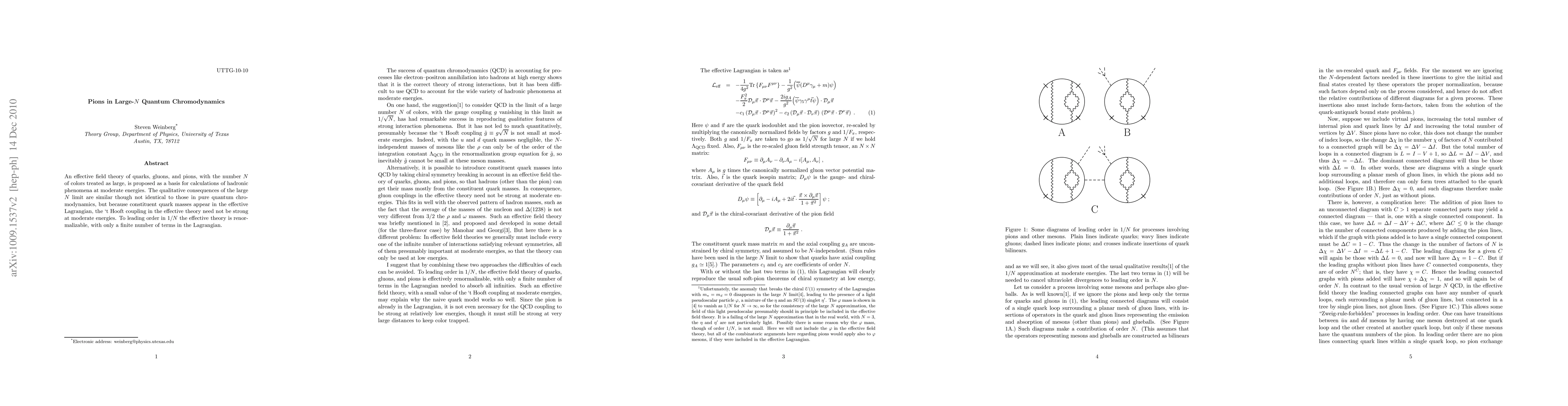 This paper proposes an effective field theory for quarks, gluons, and pions in large-$N$ quantum chromodynamics, showing that the large $N$ limit provides a simplified framework for hadronic phenomena at moderate energies, where the effective theory remains renormalizable and the `t Hooft coupling need not be strong.