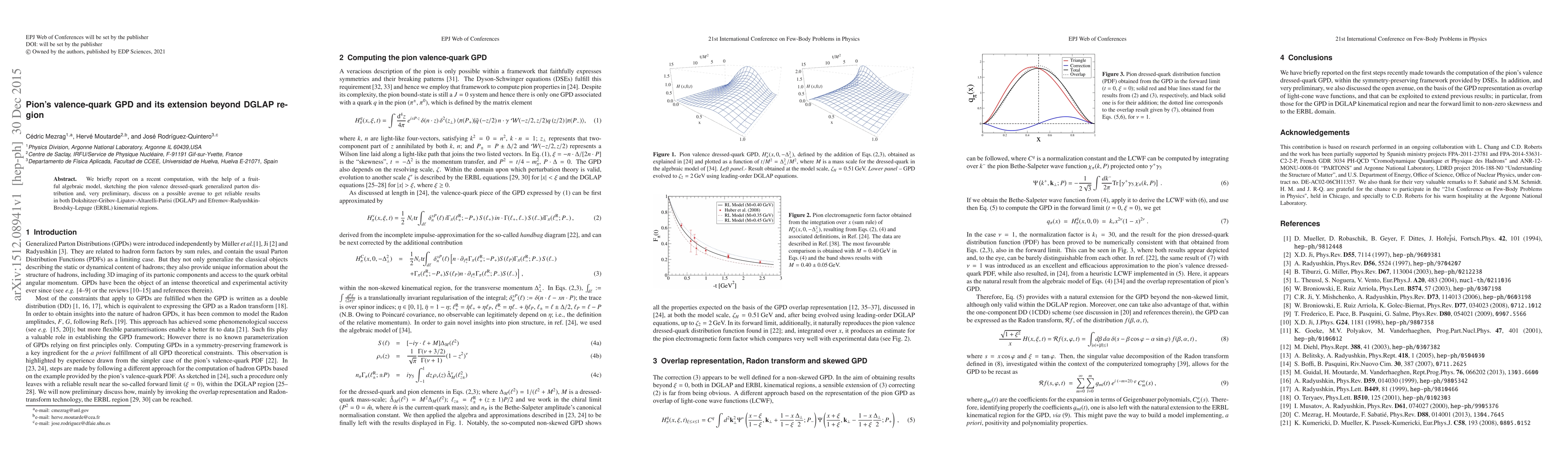 We briefly report on a recent computation, with the help of a fruitful algebraic model, sketching the pion valence dressed-quark generalized parton distribution and, very preliminary, discuss on a possible avenue to get reliable results in both Dokshitzer-Gribov-Lipatov-Altarelli-Parisi (DGLAP) and Efremov-Radyushkin-Brodsky-Lepage (ERBL) kinematial regions.