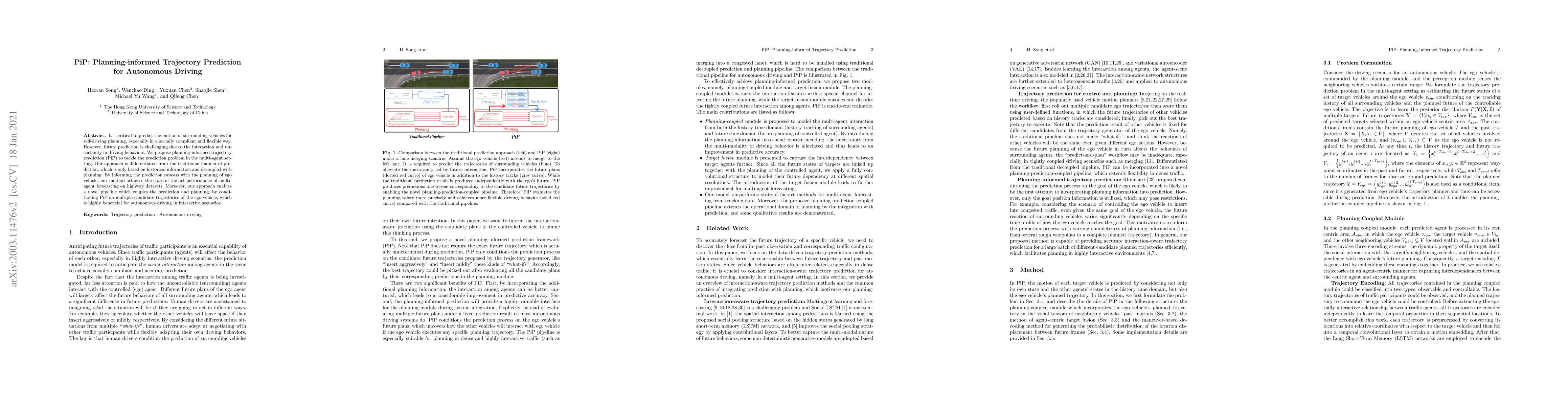 The paper proposes PiP, a planning-informed trajectory prediction method for autonomous driving, which integrates planning with prediction to enhance multi-agent forecasting performance. This approach leverages ego vehicle planning to improve prediction accuracy and enables a coupled prediction-planning pipeline beneficial for interactive driving scenarios.
