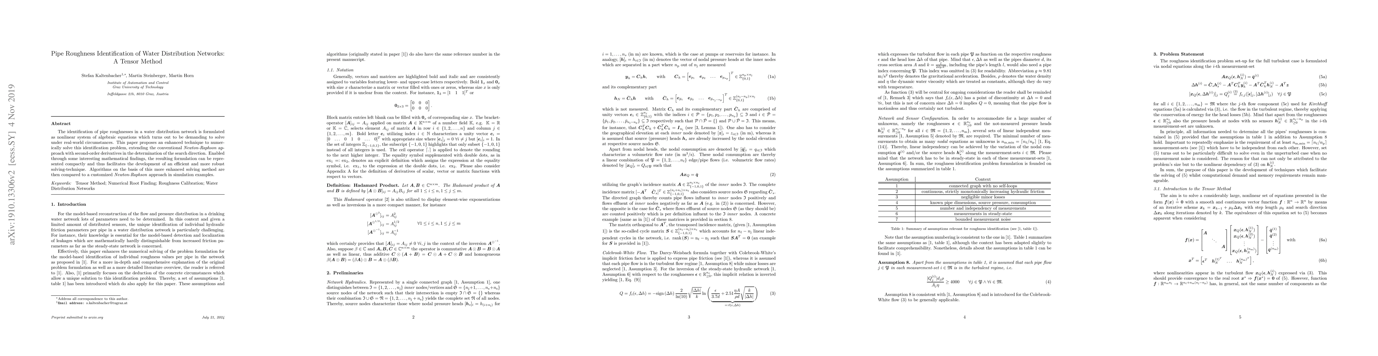 This paper proposes an advanced tensor method to solve the challenging nonlinear system of algebraic equations for identifying pipe roughness in water distribution networks, enhancing the conventional Newton-Raphson method with second-order derivatives for better robustness. Simulation results show improved efficiency compared to a customized Newton-Raphson approach.