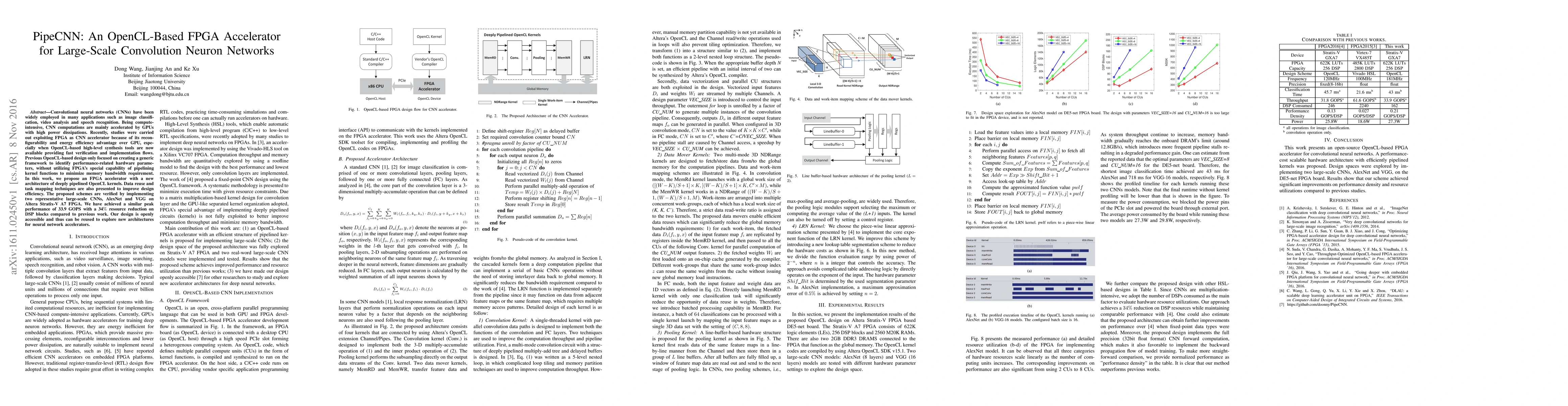 This paper proposes PipeCNN, an OpenCL-based FPGA accelerator for large-scale convolutional neural networks, utilizing deep pipelining to minimize memory bandwidth and achieve a 34% reduction in resource usage compared to previous designs. The design is verified on AlexNet and VGG, achieving 33.9 GOPS peak performance.