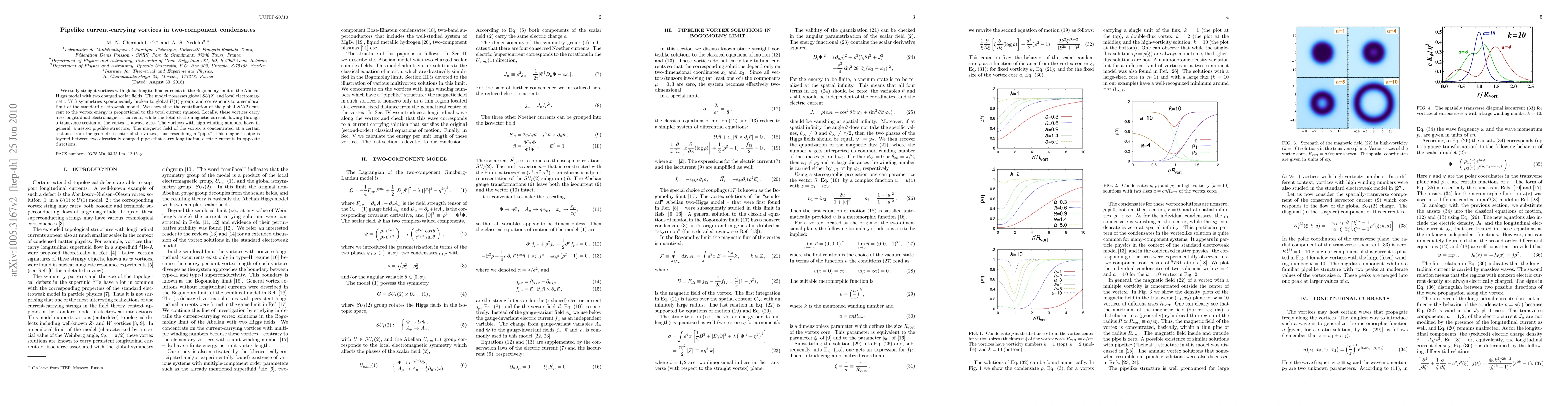 We study straight vortices with global longitudinal currents in the Bogomol'ny limit of the Abelian Higgs model with two charged scalar fields. The model possesses global SU(2) and local electromagnetic U(1) symmetries spontaneously broken to global U(1) group, and corresponds to a semilocal limit of the standard electroweak model. We show that the contribution of the global SU(2) current to the vortex energy is proportional to the total current squared. Locally, these vortices carry also longitudinal electromagnetic currents, while the total electromagnetic current flowing through a transverse section of the vortex is always zero. The vortices with high winding numbers have, in general, a nested pipelike structure. The magnetic field of the vortex is concentrated at a certain distance from the geometric center of the vortex, thus resembling a "pipe." This magnetic pipe is layered between two electrically charged pipes that carry longitudinal electric currents in opposite directions.