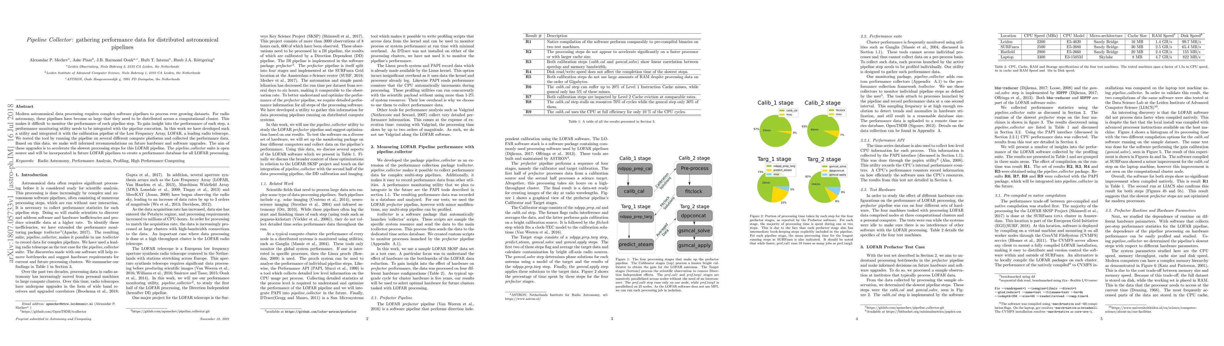 Modern astronomical data processing requires complex software pipelines to process ever growing datasets. For radio astronomy, these pipelines have become so large that they need to be distributed across a computational cluster. This makes it difficult to monitor the performance of each pipeline step. To gain insight into the performance of each step, a performance monitoring utility needs to be integrated with the pipeline execution. In this work we have developed such a utility and integrated it with the calibration pipeline of the Low Frequency Array, LOFAR, a leading radio telescope. We tested the tool by running the pipeline on several different compute platforms and collected the performance data. Based on this data, we make well informed recommendations on future hardware and software upgrades. The aim of these upgrades is to accelerate the slowest processing steps for this LOFAR pipeline. The pipeline collector suite is open source and will be incorporated in future LOFAR pipelines to create a performance database for all LOFAR processing.