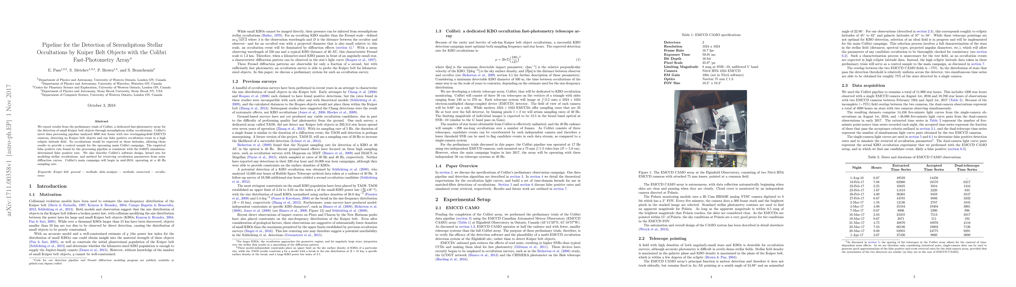 This paper presents preliminary trials of Colibri, a fast-photometry array designed for detecting Kuiper Belt objects via serendipitous stellar occultations. The pipeline analyzed 4000 star hours without detecting any occultations, providing a control sample for future campaigns.