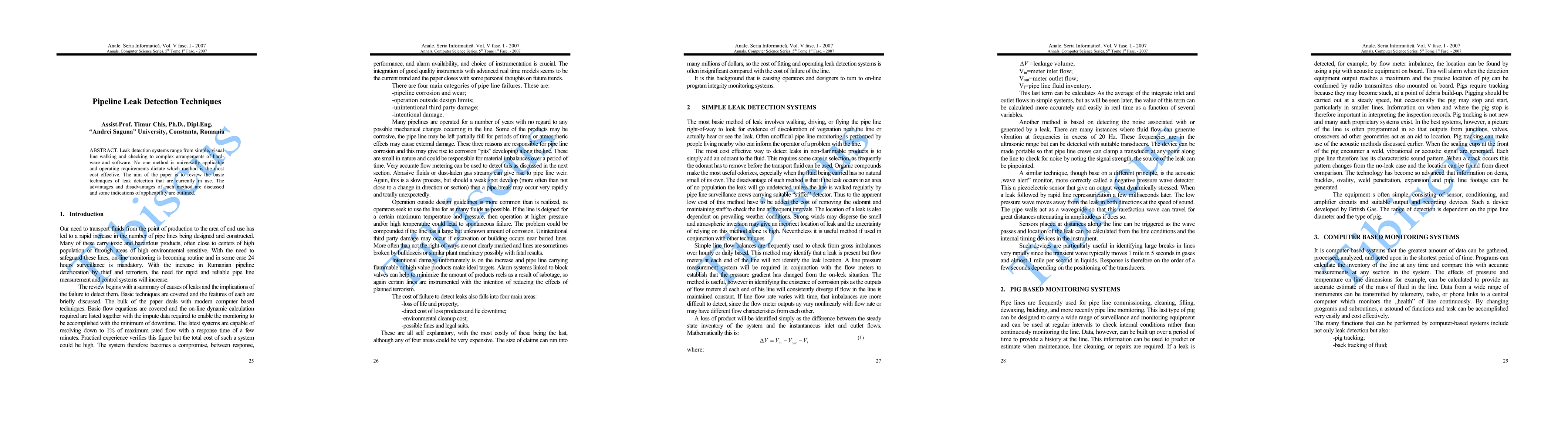 This paper reviews various leak detection techniques for pipelines, discussing their advantages and disadvantages to help determine cost-effective methods.