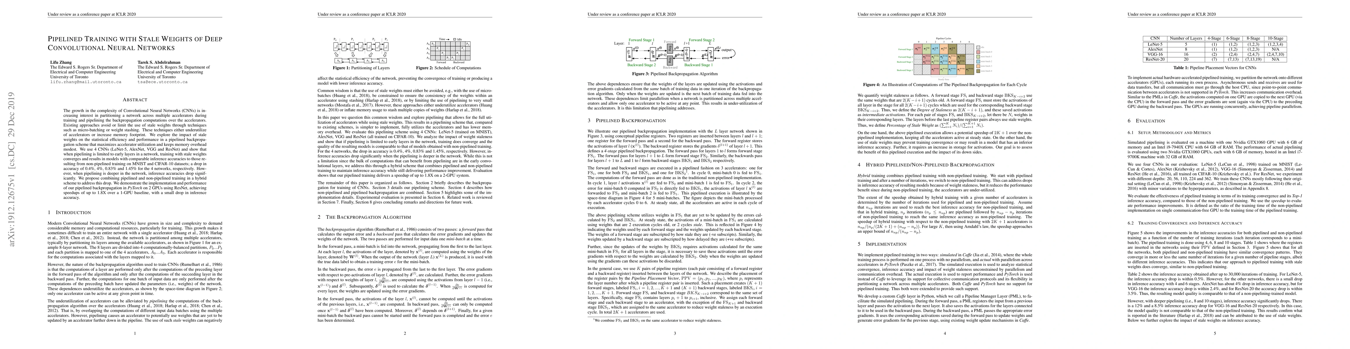 This paper explores the use of stale weights in pipelined training of deep CNNs to maximize accelerator utilization while maintaining modest memory overhead. It finds that early-layer pipelining with stale weights results in comparable model accuracies, but deeper pipelining causes significant accuracy drops, which are mitigated by a hybrid training scheme.