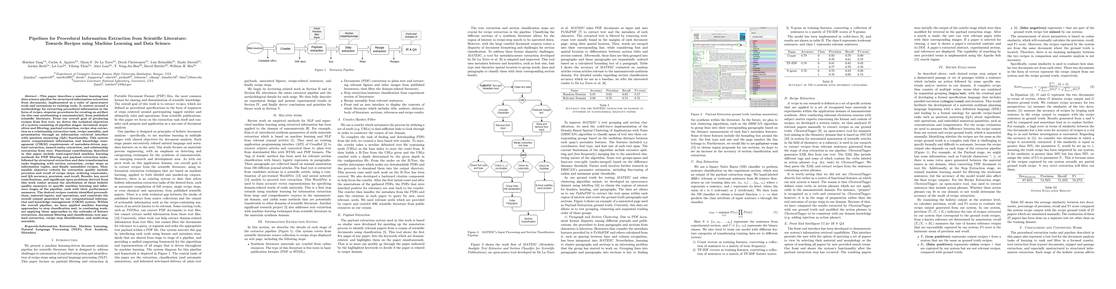 This paper describes a machine learning and data science pipeline for structured information extraction from documents, implemented as a suite of open-source tools and extensions to existing tools. It centers around a methodology for extracting procedural information in the form of recipes, stepwise procedures for creating an artifact (in this case synthesizing a nanomaterial), from published scientific literature. From our overall goal of producing recipes from free text, we derive the technical objectives of a system consisting of pipeline stages: document acquisition and filtering, payload extraction, recipe step extraction as a relationship extraction task, recipe assembly, and presentation through an information retrieval interface with question answering (QA) functionality. This system meets computational information and knowledge management (CIKM) requirements of metadata-driven payload extraction, named entity extraction, and relationship extraction from text. Functional contributions described in this paper include semi-supervised machine learning methods for PDF filtering and payload extraction tasks, followed by structured extraction and data transformation tasks beginning with section extraction, recipe steps as information tuples, and finally assembled recipes. Measurable objective criteria for extraction quality include precision and recall of recipe steps, ordering constraints, and QA accuracy, precision, and recall. Results, key novel contributions, and significant open problems derived from this work center around the attribution of these holistic quality measures to specific machine learning and inference stages of the pipeline, each with their performance measures. The desired recipes contain identified preconditions, material inputs, and operations, and constitute the overall output generated by our computational information and knowledge management (CIKM) system.