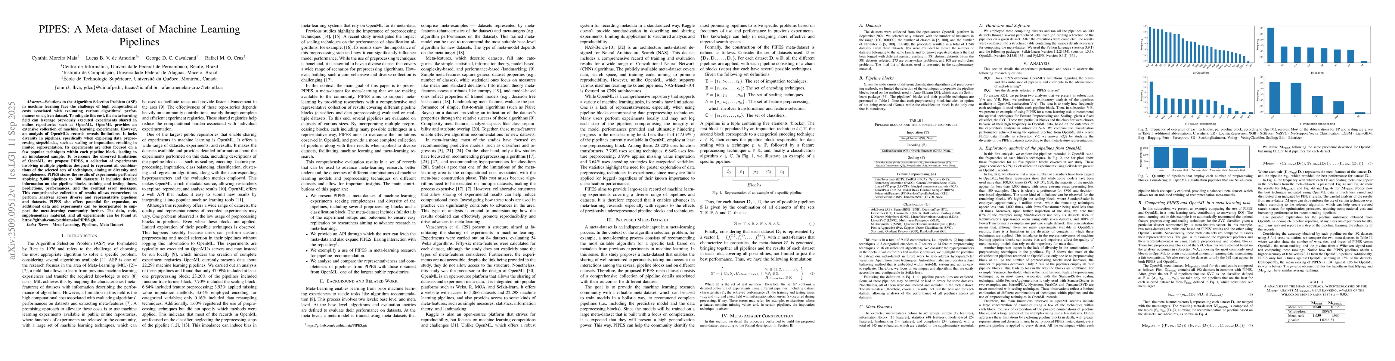 Solutions to the Algorithm Selection Problem (ASP) in machine learning face the challenge of high computational costs associated with evaluating various algorithms' performances on a given dataset. To mitigate this cost, the meta-learning field can leverage previously executed experiments shared in online repositories such as OpenML. OpenML provides an extensive collection of machine learning experiments. However, an analysis of OpenML's records reveals limitations. It lacks diversity in pipelines, specifically when exploring data preprocessing steps/blocks, such as scaling or imputation, resulting in limited representation. Its experiments are often focused on a few popular techniques within each pipeline block, leading to an imbalanced sample. To overcome the observed limitations of OpenML, we propose PIPES, a collection of experiments involving multiple pipelines designed to represent all combinations of the selected sets of techniques, aiming at diversity and completeness. PIPES stores the results of experiments performed applying 9,408 pipelines to 300 datasets. It includes detailed information on the pipeline blocks, training and testing times, predictions, performances, and the eventual error messages. This comprehensive collection of results allows researchers to perform analyses across diverse and representative pipelines and datasets. PIPES also offers potential for expansion, as additional data and experiments can be incorporated to support the meta-learning community further. The data, code, supplementary material, and all experiments can be found at https://github.com/cynthiamaia/PIPES.git.