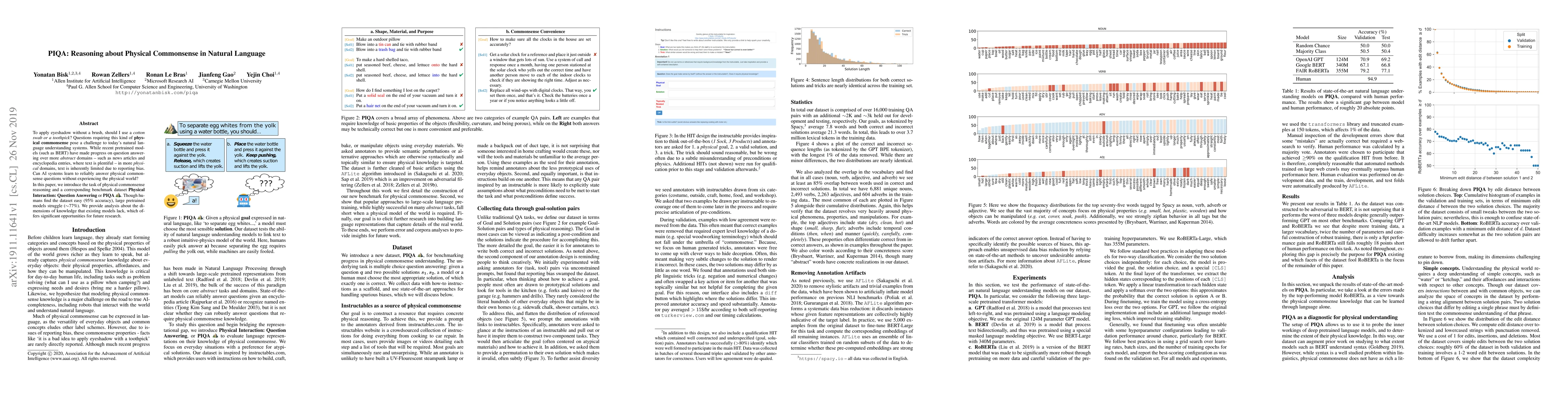 To apply eyeshadow without a brush, should I use a cotton swab or a toothpick? Questions requiring this kind of physical commonsense pose a challenge to today's natural language understanding systems. While recent pretrained models (such as BERT) have made progress on question answering over more abstract domains - such as news articles and encyclopedia entries, where text is plentiful - in more physical domains, text is inherently limited due to reporting bias. Can AI systems learn to reliably answer physical common-sense questions without experiencing the physical world? In this paper, we introduce the task of physical commonsense reasoning and a corresponding benchmark dataset Physical Interaction: Question Answering or PIQA. Though humans find the dataset easy (95% accuracy), large pretrained models struggle (77%). We provide analysis about the dimensions of knowledge that existing models lack, which offers significant opportunities for future research.