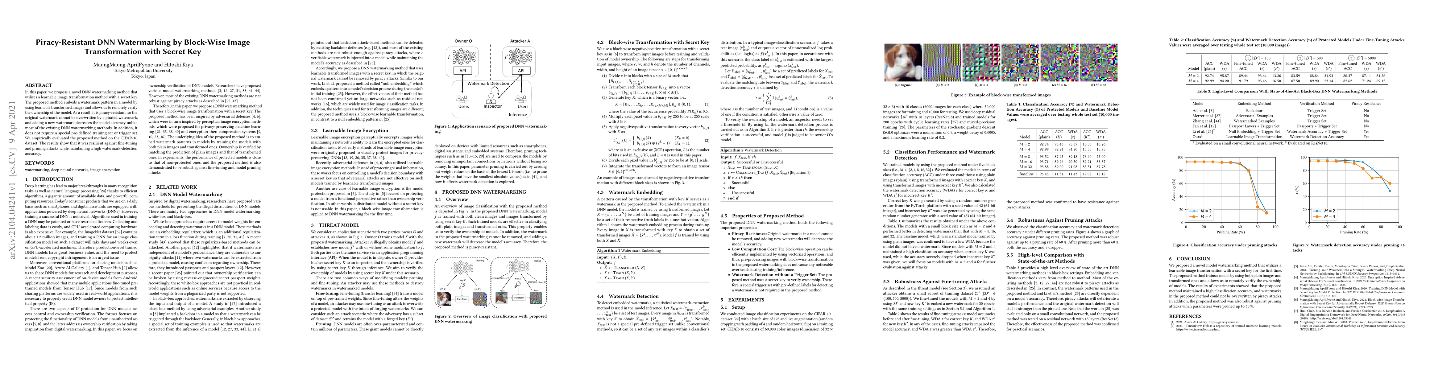 This paper introduces a novel DNN watermarking technique that embeds a watermark using learnable image transformations and a secret key, ensuring piracy resistance and high watermark-detection accuracy. The method was tested on CIFAR-10, demonstrating resilience against fine-tuning and pruning attacks without requiring a predefined training set.