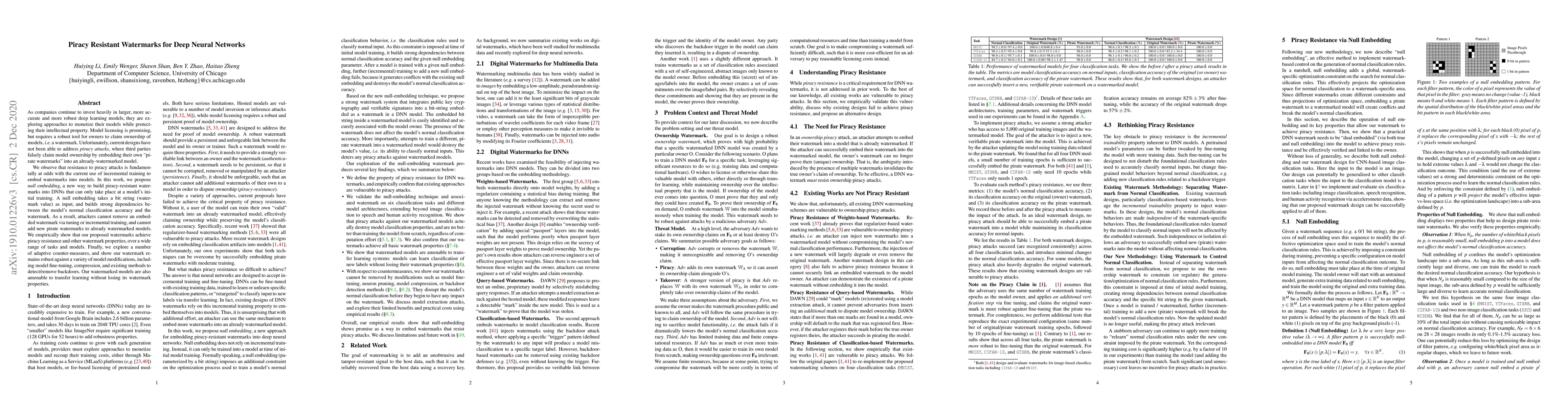 This paper proposes "null embedding," a novel method to create piracy-resistant watermarks in deep neural networks (DNNs) that can only be embedded during initial training. This approach ensures that watermarks cannot be removed or replaced through incremental training, providing robust protection against piracy attacks.