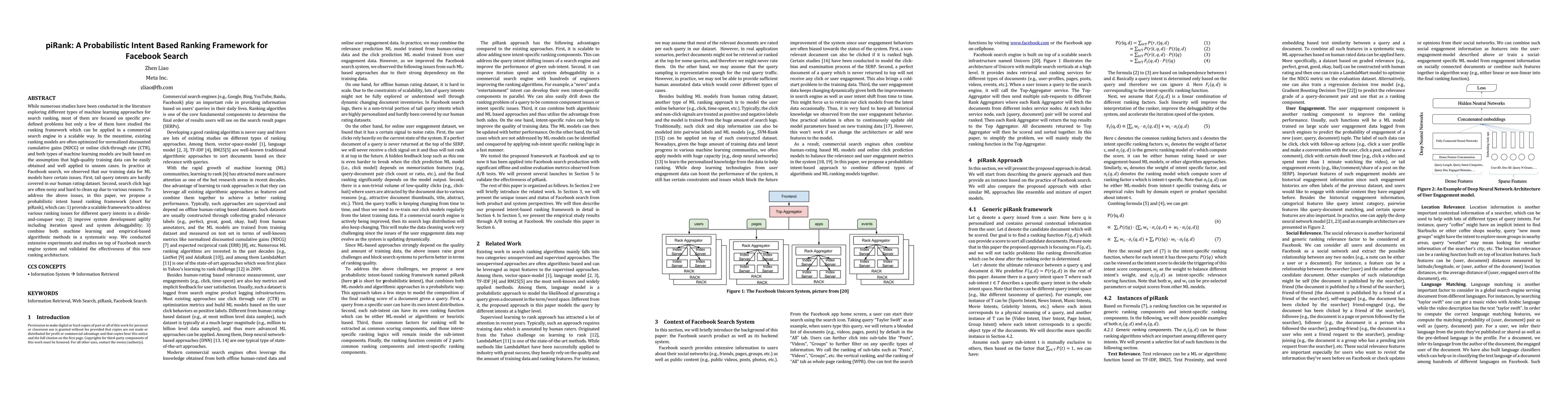 This paper introduces piRank, a probabilistic intent-based ranking framework for Facebook search that addresses common issues in machine learning-based search models, offering scalability and improved system development agility.