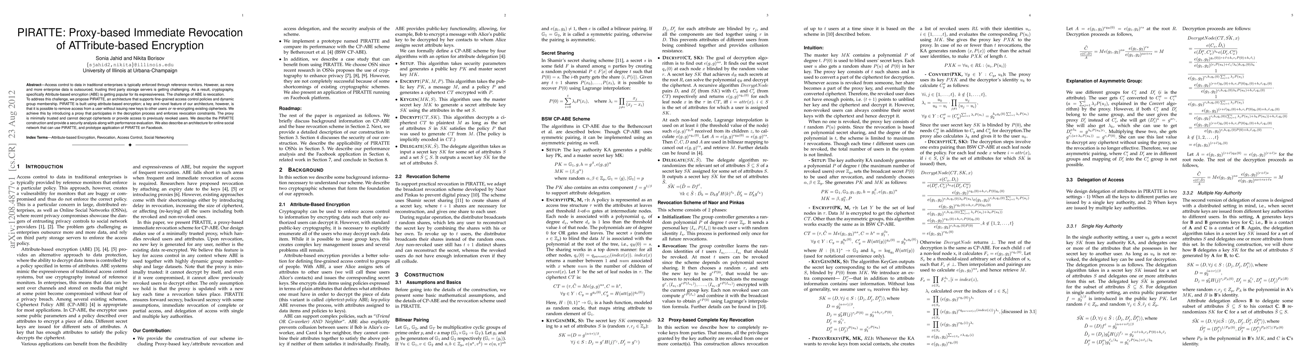 PIRATTE proposes an architecture for immediate revocation in attribute-based encryption, using a minimally trusted proxy to enforce revocation without re-encrypting data or issuing new keys. The system supports fine-grained access control and dynamic group membership, demonstrated through a prototype application on Facebook.