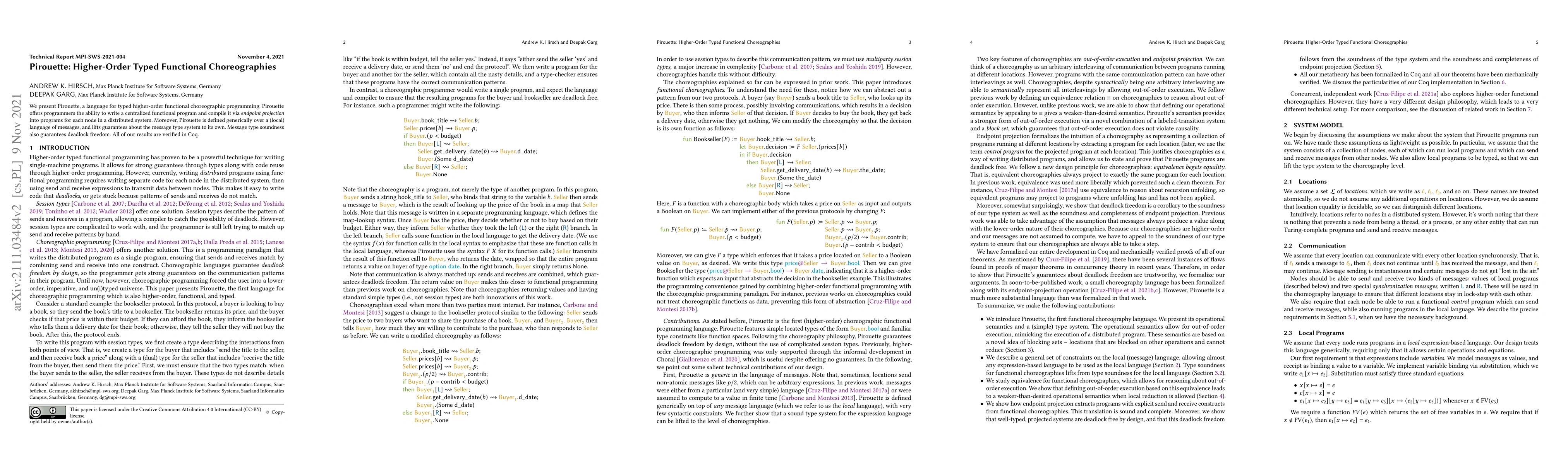 Pirouette is a typed language for higher-order functional choreographic programming that compiles centralized programs into distributed node-specific implementations, ensuring message type soundness and deadlock freedom. Formal proofs of these properties are verified in Coq.