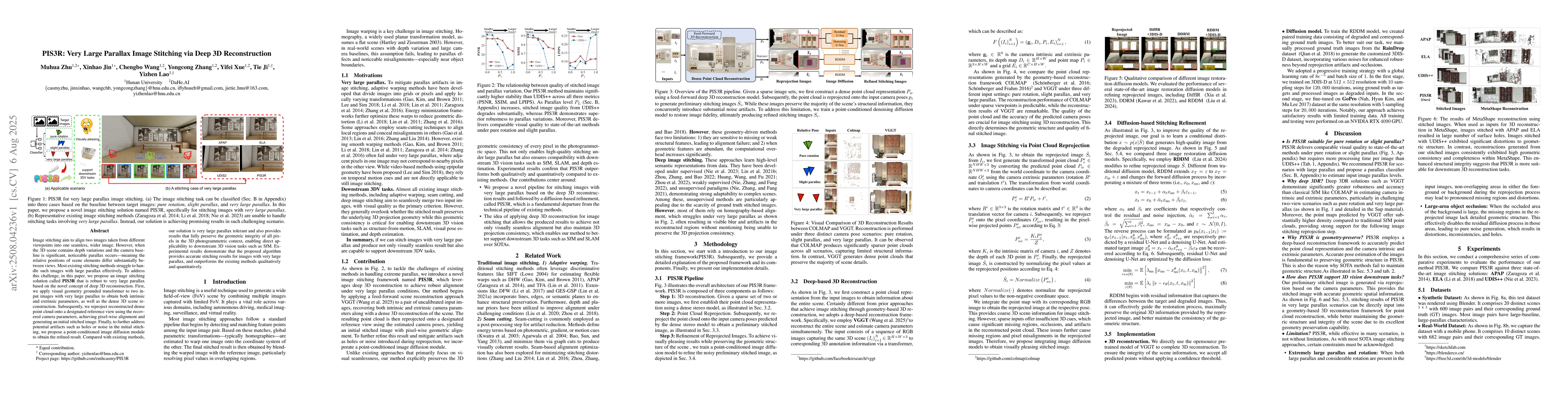 Image stitching aim to align two images taken from different viewpoints into one seamless, wider image. However, when the 3D scene contains depth variations and the camera baseline is significant, noticeable parallax occurs-meaning the relative positions of scene elements differ substantially between views. Most existing stitching methods struggle to handle such images with large parallax effectively. To address this challenge, in this paper, we propose an image stitching solution called PIS3R that is robust to very large parallax based on the novel concept of deep 3D reconstruction. First, we apply visual geometry grounded transformer to two input images with very large parallax to obtain both intrinsic and extrinsic parameters, as well as the dense 3D scene reconstruction. Subsequently, we reproject reconstructed dense point cloud onto a designated reference view using the recovered camera parameters, achieving pixel-wise alignment and generating an initial stitched image. Finally, to further address potential artifacts such as holes or noise in the initial stitching, we propose a point-conditioned image diffusion module to obtain the refined result.Compared with existing methods, our solution is very large parallax tolerant and also provides results that fully preserve the geometric integrity of all pixels in the 3D photogrammetric context, enabling direct applicability to downstream 3D vision tasks such as SfM. Experimental results demonstrate that the proposed algorithm provides accurate stitching results for images with very large parallax, and outperforms the existing methods qualitatively and quantitatively.