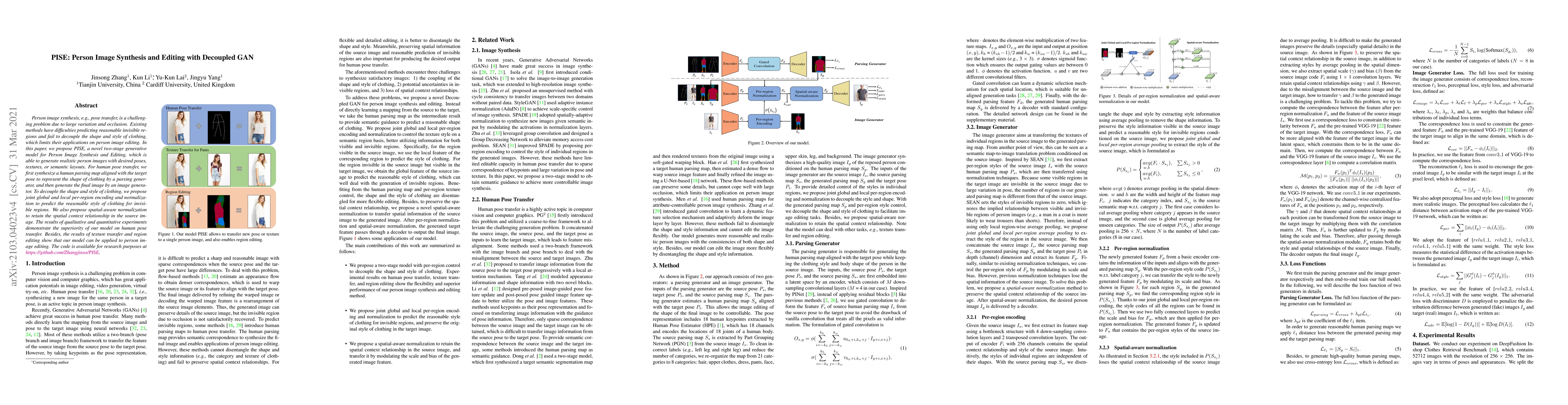 PISE is a two-stage generative model for synthesizing and editing person images, addressing pose transfer, texture, and semantic layout challenges. It decouples shape and style through global and local encoding, achieving realistic results in pose, texture, and region editing.