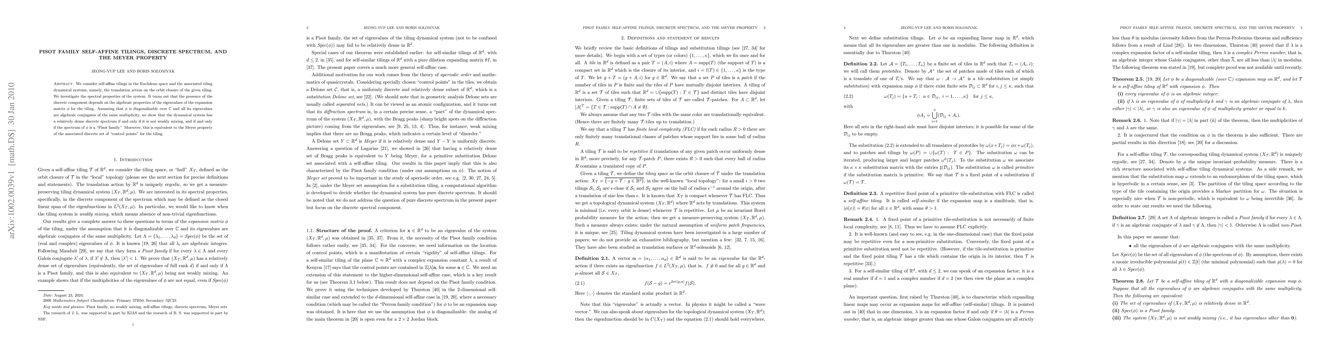 We consider self-affine tilings in the Euclidean space and the associated tiling dynamical systems, namely, the translation action on the orbit closure of the given tiling. We investigate the spectral properties of the system. It turns out that the presence of the discrete component depends on the algebraic properties of the eigenvalues of the expansion matrix $\phi$ for the tiling. Assuming that $\phi$ is diagonalizable over $\C$ and all its eigenvalues are algebraic conjugates of the same multiplicity, we show that the dynamical system has a relatively dense discrete spectrum if and only if it is not weakly mixing, and if and only if the spectrum of $\phi$ is a "Pisot family". Moreover, this is equivalent to the Meyer property of the associated discrete set of "control points" for the tiling.