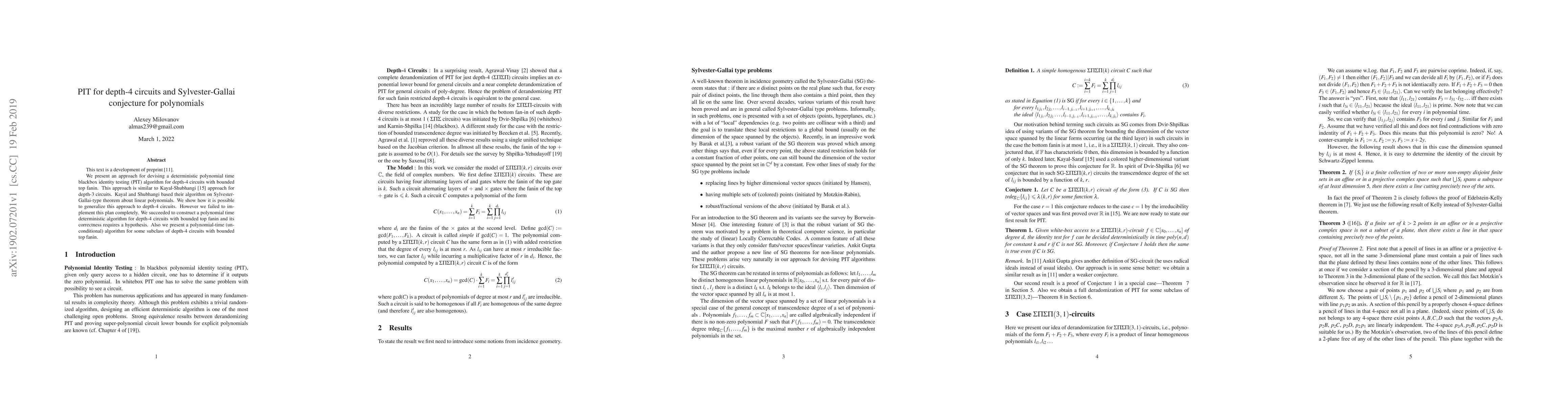 This paper builds on previous work to create a deterministic polynomial time blackbox identity testing (PIT) algorithm for depth-4 circuits with bounded top fanin, though full generalization wasn't achieved. It also introduces a polynomial-time algorithm for a specific subclass of such circuits, with correctness relying on a hypothesis.