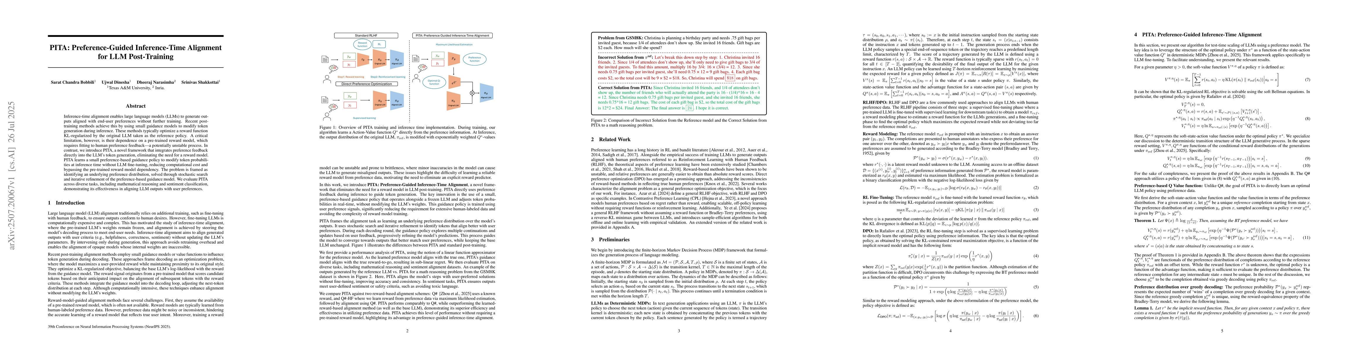 Inference-time alignment enables large language models (LLMs) to generate outputs aligned with end-user preferences without further training. Recent post-training methods achieve this by using small guidance models to modify token generation during inference. These methods typically optimize a reward function KL-regularized by the original LLM taken as the reference policy. A critical limitation, however, is their dependence on a pre-trained reward model, which requires fitting to human preference feedback--a potentially unstable process. In contrast, we introduce PITA, a novel framework that integrates preference feedback directly into the LLM's token generation, eliminating the need for a reward model. PITA learns a small preference-based guidance policy to modify token probabilities at inference time without LLM fine-tuning, reducing computational cost and bypassing the pre-trained reward model dependency. The problem is framed as identifying an underlying preference distribution, solved through stochastic search and iterative refinement of the preference-based guidance model. We evaluate PITA across diverse tasks, including mathematical reasoning and sentiment classification, demonstrating its effectiveness in aligning LLM outputs with user preferences.