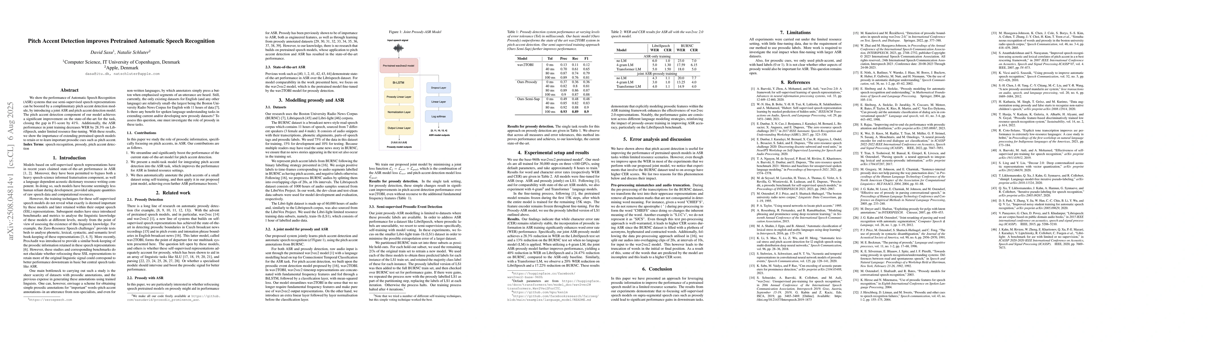 We show the performance of Automatic Speech Recognition (ASR) systems that use semi-supervised speech representations can be boosted by a complimentary pitch accent detection module, by introducing a joint ASR and pitch accent detection model. The pitch accent detection component of our model achieves a significant improvement on the state-of-the-art for the task, closing the gap in F1-score by 41%. Additionally, the ASR performance in joint training decreases WER by 28.3% on LibriSpeech, under limited resource fine-tuning. With these results, we show the importance of extending pretrained speech models to retain or re-learn important prosodic cues such as pitch accent.