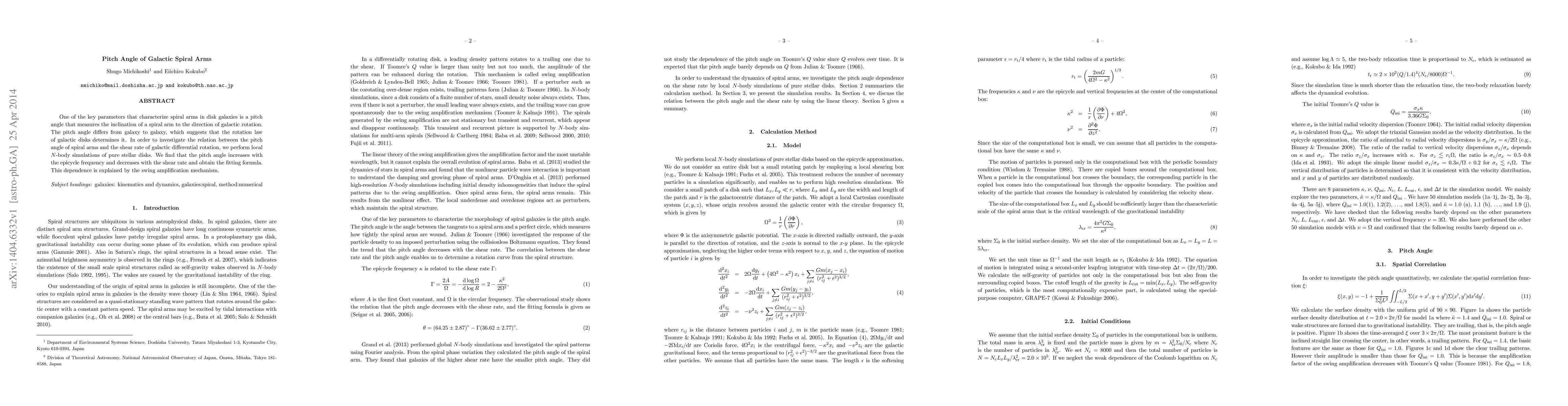 This study investigates the pitch angle of spiral arms in disk galaxies through local $N$-body simulations, revealing that it increases with the epicycle frequency and decreases with shear rate. The findings support a swing amplification mechanism explaining these relationships.