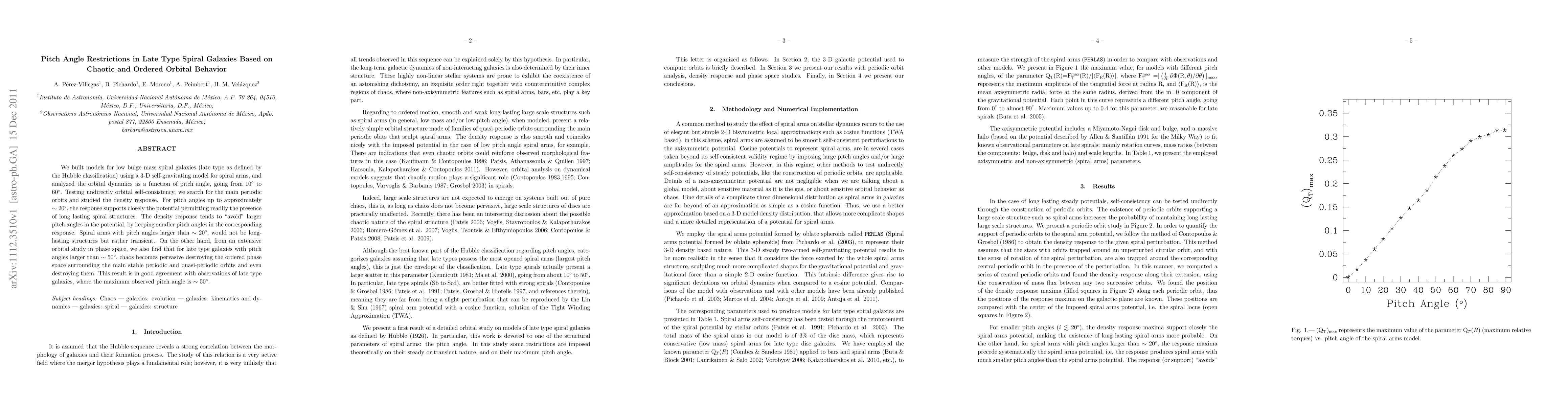 We built models for low bulge mass spiral galaxies (late type as defined by the Hubble classification) using a 3-D self-gravitating model for spiral arms, and analyzed the orbital dynamics as a function of pitch angle, going from 10$\deg$ to 60$\deg$. Testing undirectly orbital self-consistency, we search for the main periodic orbits and studied the density response. For pitch angles up to approximately $\sim 20\deg$, the response supports closely the potential permitting readily the presence of long lasting spiral structures. The density response tends to "avoid" larger pitch angles in the potential, by keeping smaller pitch angles in the corresponding response. Spiral arms with pitch angles larger than $\sim 20\deg$, would not be long-lasting structures but rather transient. On the other hand, from an extensive orbital study in phase space, we also find that for late type galaxies with pitch angles larger than $\sim 50\deg$, chaos becomes pervasive destroying the ordered phase space surrounding the main stable periodic and quasi-periodic orbits and even destroying them. This result is in good agreement with observations of late type galaxies, where the maximum observed pitch angle is $\sim 50\deg$.