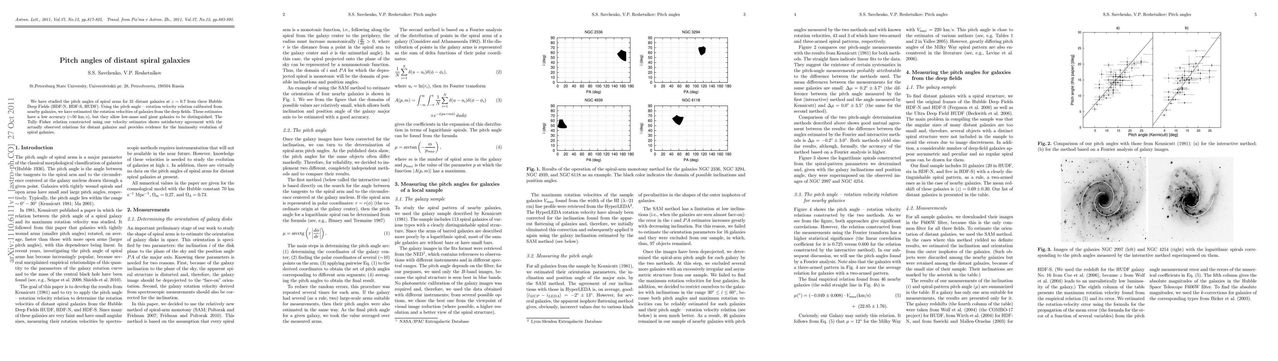 This study investigates the pitch angles of spiral arms in 31 distant galaxies at z~0.7, estimating their rotation velocities using a calibrated relation from nearby galaxies. The findings suggest a luminosity evolution of spiral galaxies and provide a satisfactory Tully-Fisher relation agreement.