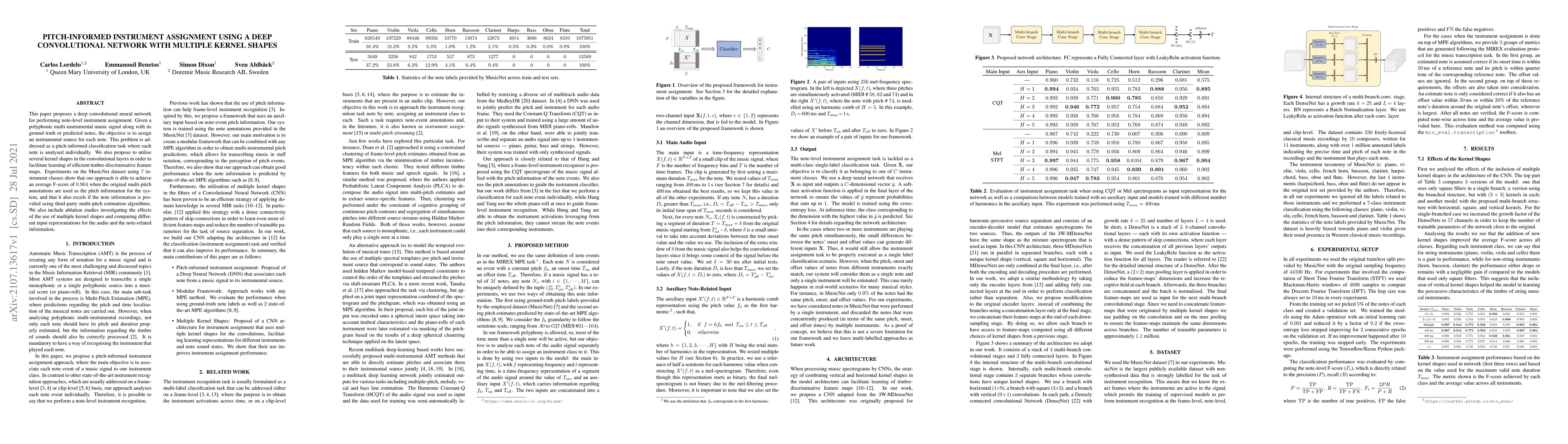 This paper introduces a deep convolutional neural network employing multiple kernel shapes to assign instruments to individual notes in polyphonic music signals. The method achieves an average F-score of 0.904 on the MusicNet dataset, demonstrating effective timbre-discriminative feature learning and robustness to different input sources.