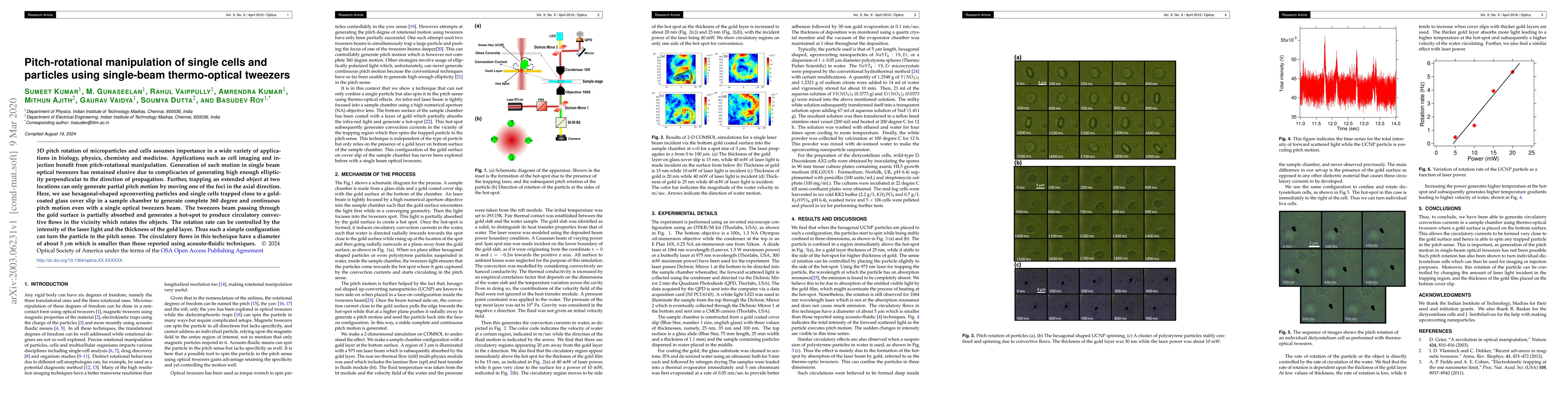 This paper describes a novel method for achieving 3D pitch rotation of single cells and particles using a single-beam thermo-optical tweezer. By utilizing hexagonal-shaped upconverting particles and a gold-coated glass cover slip, the technique generates circulatory convective flows to rotate objects, enabling complete 360-degree pitch motion controlled by laser intensity and gold layer thickness.