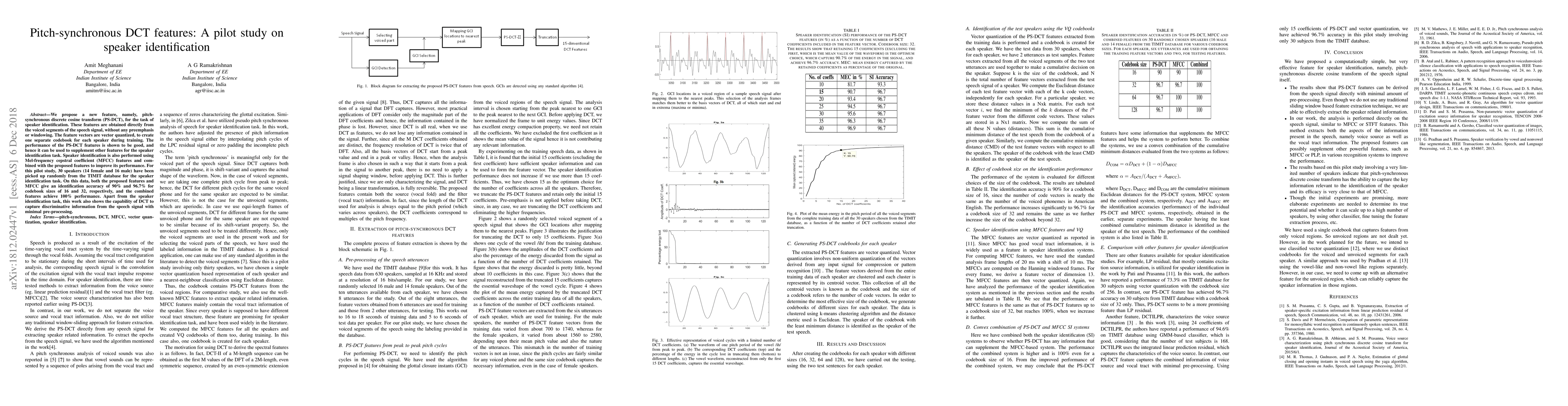 This paper introduces pitch-synchronous discrete cosine transform (PS-DCT) features for speaker identification, showing they perform well and can enhance MFCC features. Experiments on 30 speakers from the TIMIT database achieved 90% accuracy with PS-DCT and 96.7% with MFCC, with combined features reaching 100% accuracy.