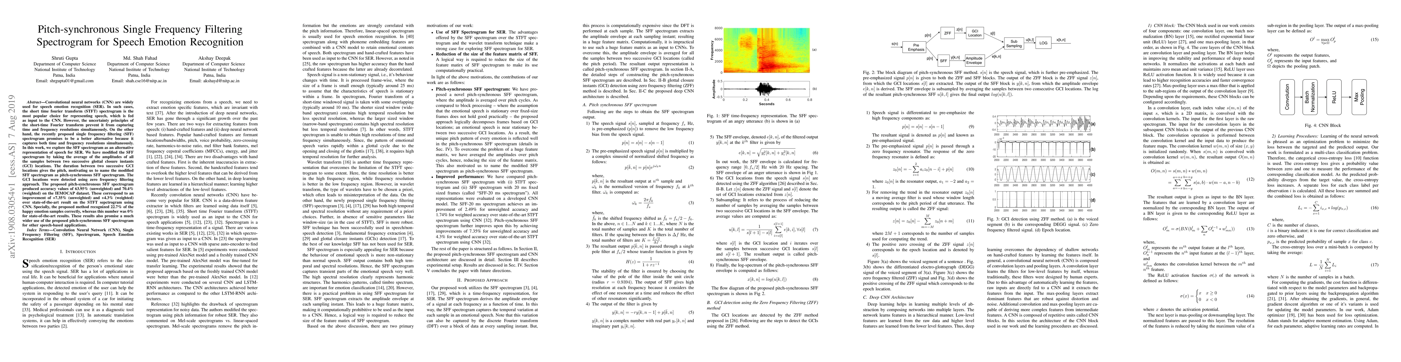 A new speech emotion recognition method uses a pitch-synchronous single frequency filtering spectrogram to capture both time and frequency resolutions simultaneously, achieving improved accuracy of 63.95% and 70.4% on the IEMOCAP dataset.