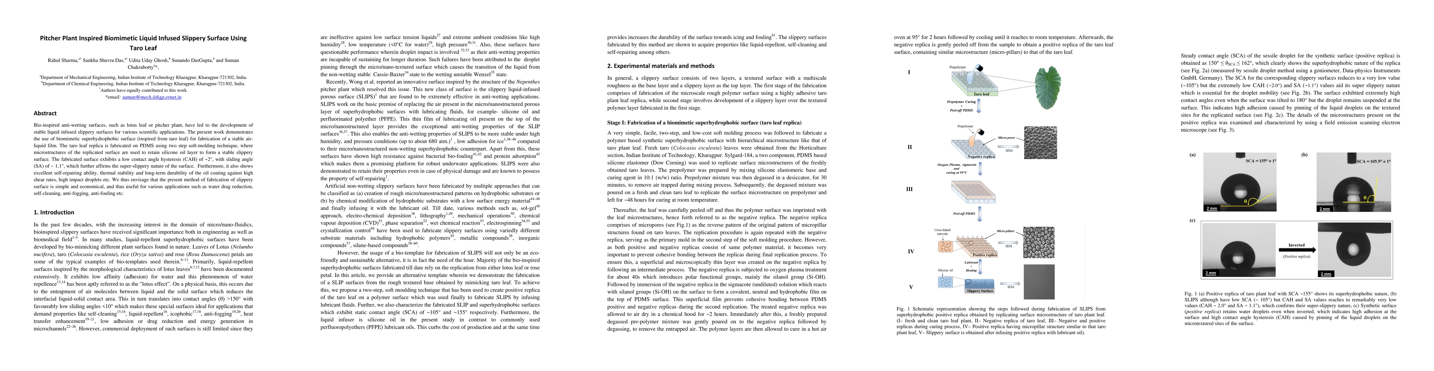 The research demonstrates fabrication of a biomimetic slippery surface using taro leaf replica on PDMS via a two-step soft-molding technique, retaining silicone oil for a stable air-liquid film.