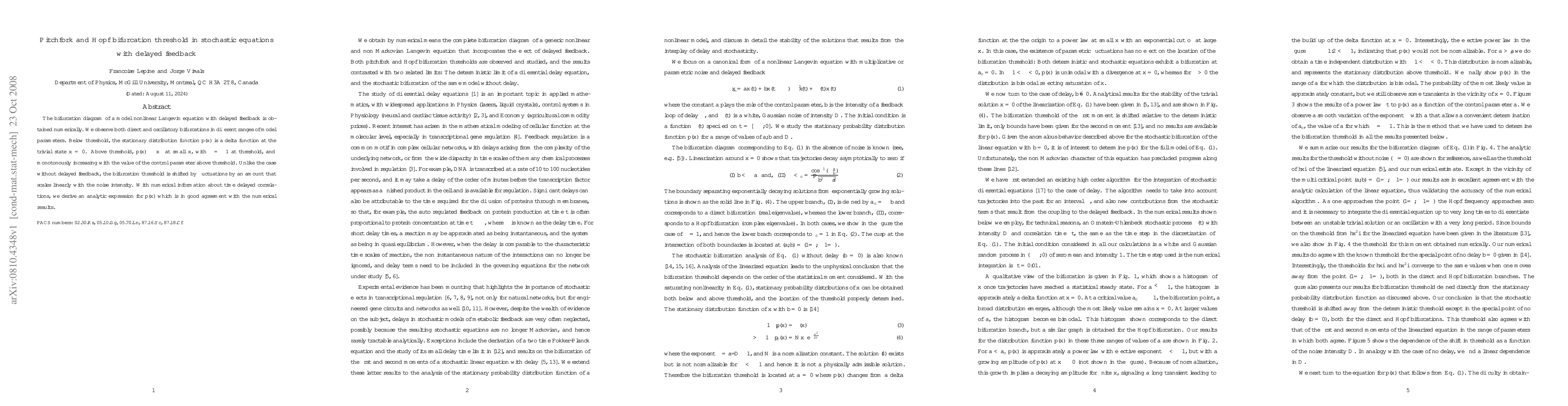 This paper investigates bifurcations in a stochastic nonlinear Langevin equation with delayed feedback, identifying both direct and oscillatory bifurcations. The bifurcation threshold shifts linearly with noise intensity, and an analytic expression for the stationary distribution is derived, matching numerical results.