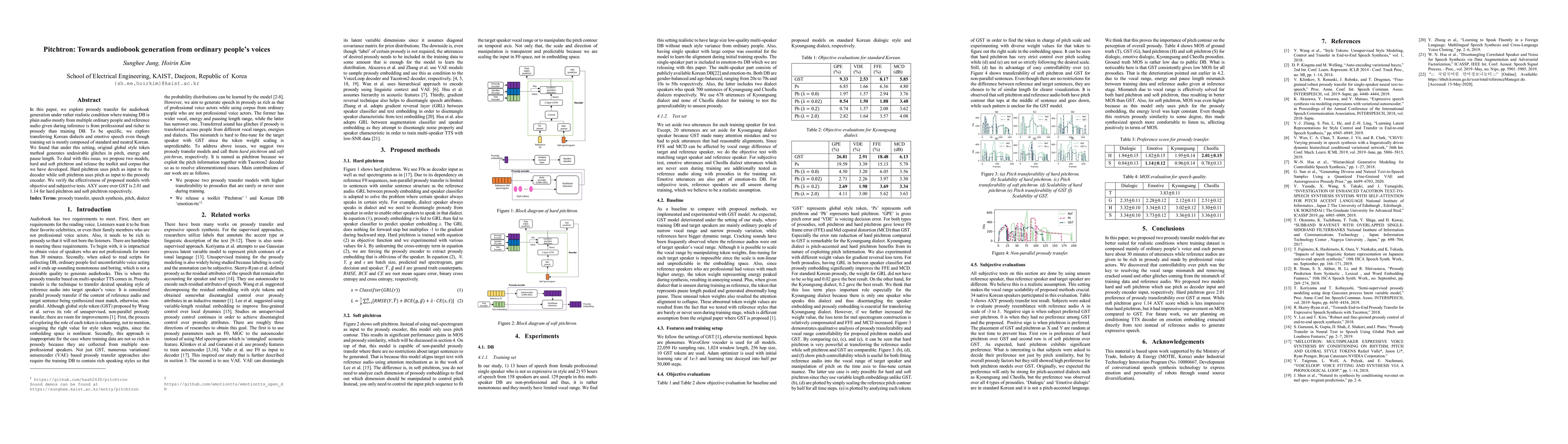 Researchers developed a system to generate audiobooks from ordinary people's voices, addressing issues with pitch, energy, and pause length. Their proposed models, Hard Pitchtron and Soft Pitchtron, show promise in generating high-quality audio.