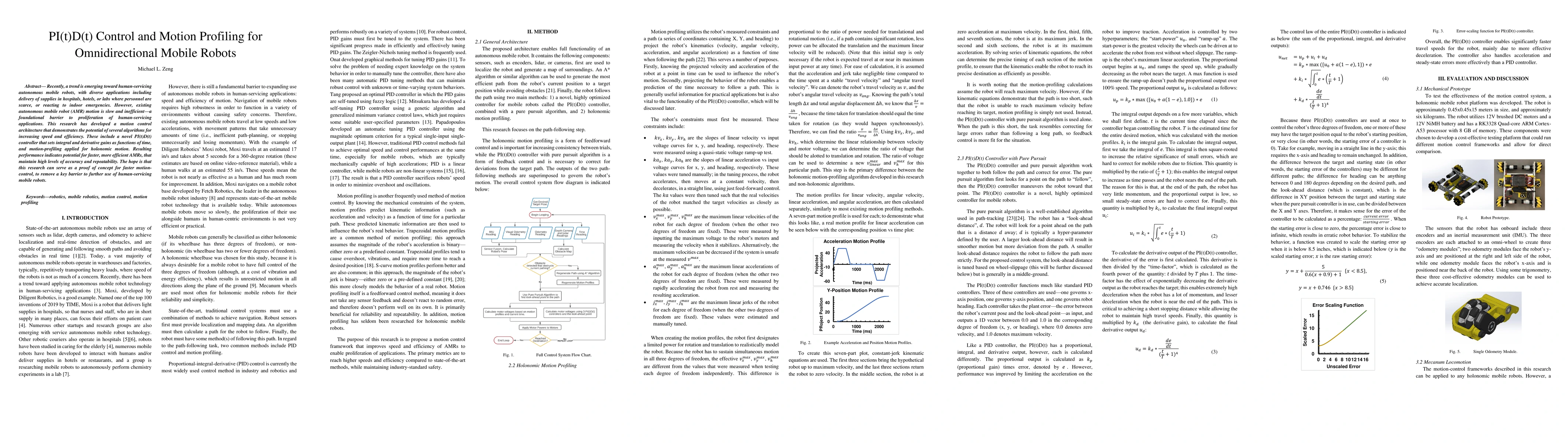 This paper proposes a PI(t)D(t) control architecture for omnidirectional mobile robots, aiming to enhance speed and efficiency in human-servicing applications. The novel PI(t)D(t) controller and motion profiling techniques demonstrate significant improvements in performance, suggesting a pathway to more agile and accurate autonomous mobile robots.