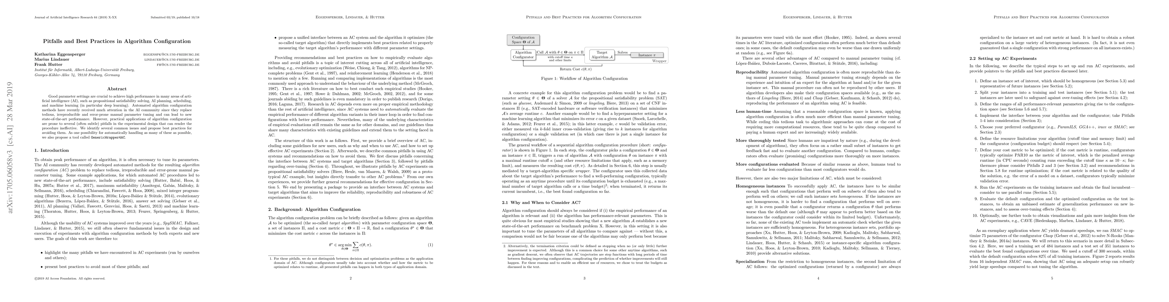This paper discusses the importance of automated algorithm configuration in AI, highlighting common pitfalls in experimental design and proposing best practices to avoid them. It also introduces a tool, GenericWrapper4AC, to help manage these issues effectively.