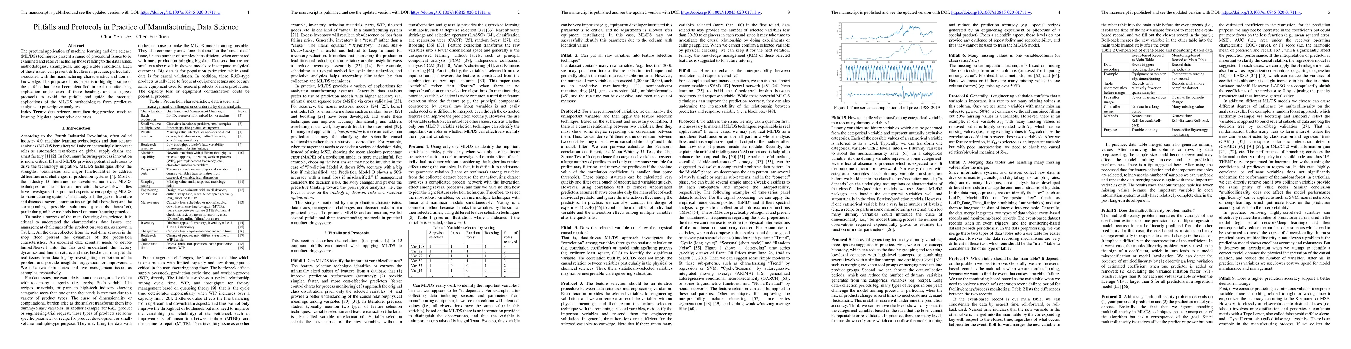 The practical application of machine learning and data science (ML/DS) techniques present a range of procedural issues to be examined and resolve including those relating to the data issues, methodologies, assumptions, and applicable conditions. Each of these issues can present difficulties in practice; particularly, associated with the manufacturing characteristics and domain knowledge. The purpose of this paper is to highlight some of the pitfalls that have been identified in real manufacturing application under each of these headings and to suggest protocols to avoid the pitfalls and guide the practical applications of the ML/DS methodologies from predictive analytics to prescriptive analytics.