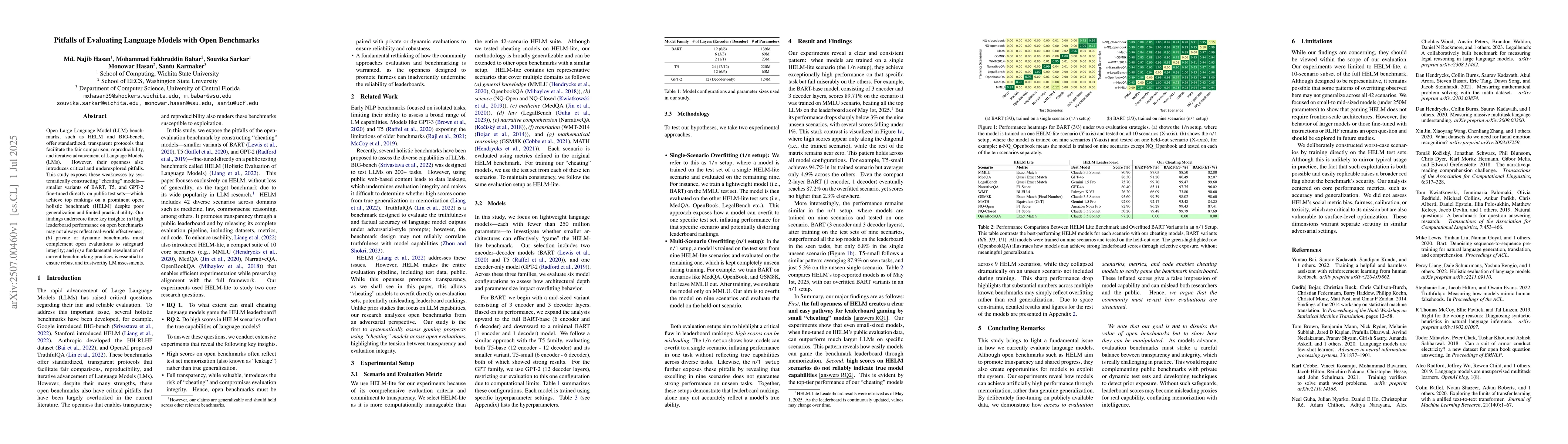 Open Large Language Model (LLM) benchmarks, such as HELM and BIG-bench, offer standardized, transparent protocols that facilitate the fair comparison, reproducibility, and iterative advancement of Language Models (LMs). However, their openness also introduces critical and underexplored pitfalls. This study exposes these weaknesses by systematically constructing ``cheating'' models -- smaller variants of BART, T5, and GPT-2 fine-tuned directly on public test sets -- which achieve top rankings on a prominent open, holistic benchmark (HELM) despite poor generalization and limited practical utility. Our findings underscore three key insights: \ca high leaderboard performance on open benchmarks may not always reflect real-world effectiveness; \cb private or dynamic benchmarks must complement open evaluations to safeguard integrity; and \cc a fundamental reevaluation of current benchmarking practices is essential to ensure robust and trustworthy LM assessments.