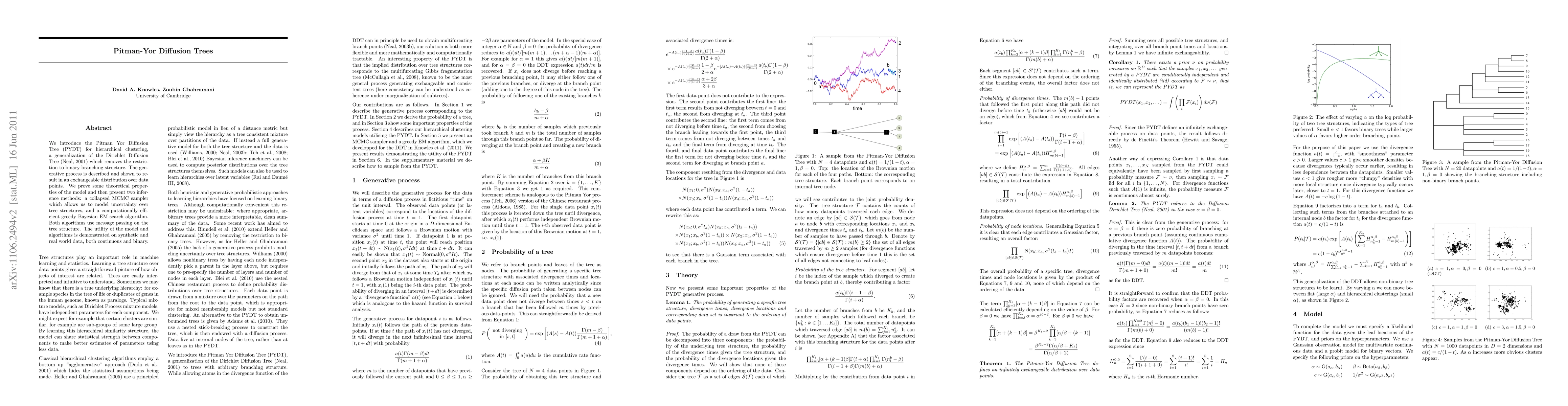 The Pitman-Yor Diffusion Tree (PYDT) generalizes the Dirichlet Diffusion Tree for flexible hierarchical clustering, offering a generative process that results in an exchangeable distribution over data points. The paper presents two inference methods—a collapsed MCMC sampler and a greedy Bayesian EM algorithm—both utilizing message passing, and demonstrates their effectiveness on various datasets.