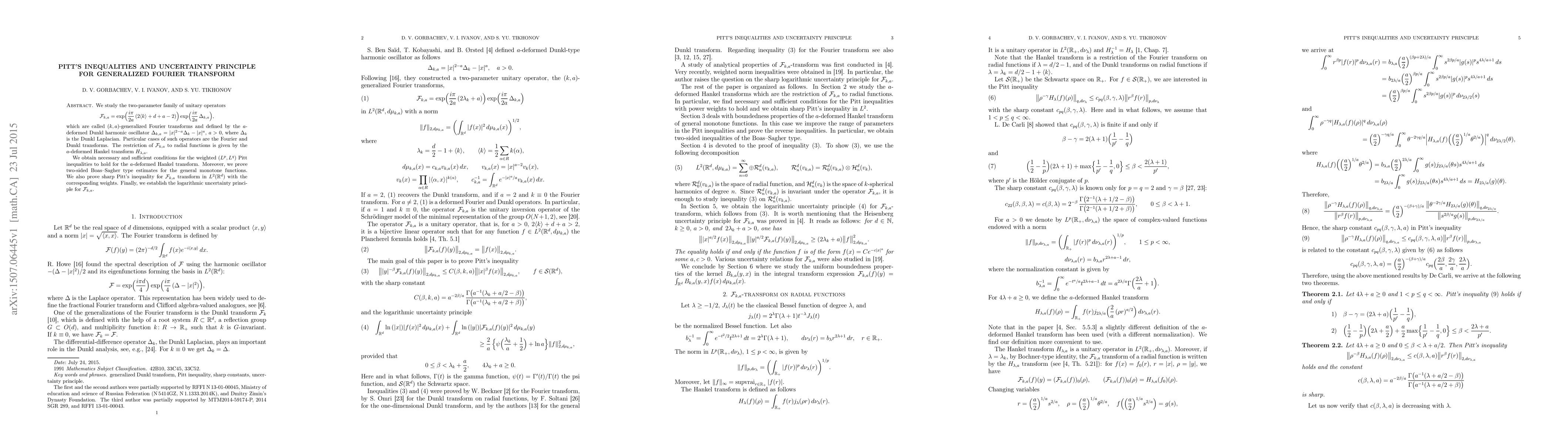 We study the two-parameter family of unitary operators \[ \mathcal{F}_{k,a}=\exp\Bigl(\frac{i\pi}{2a}\,(2\langle k\rangle+{d}+a-2 )\Bigr) \exp\Bigl(\frac{i\pi}{2a}\,\Delta_{k,a}\Bigr), \] which are called $(k,a)$-generalized Fourier transforms and defined by the $a$-deformed Dunkl harmonic oscillator $\Delta_{k,a}=|x|^{2-a}\Delta_{k}-|x|^{a}$, $a>0$, where $\Delta_{k}$ is the Dunkl Laplacian. Particular cases of such operators are the Fourier and Dunkl transforms. The restriction of $\mathcal{F}_{k,a}$ to radial functions is given by the $a$-deformed Hankel transform $H_{\lambda,a}$. We obtain necessary and sufficient conditions for the weighted $(L^{p},L^{q})$ Pitt inequalities to hold for the $a$-deformed Hankel transform. Moreover, we prove two-sided Boas--Sagher type estimates for the general monotone functions. We also prove sharp Pitt's inequality for $\mathcal{F}_{k,a}$ transform in $L^{2}(\mathbb{R}^{d})$ with the corresponding weights. Finally, we establish the logarithmic uncertainty principle for $\mathcal{F}_{k,a}$.