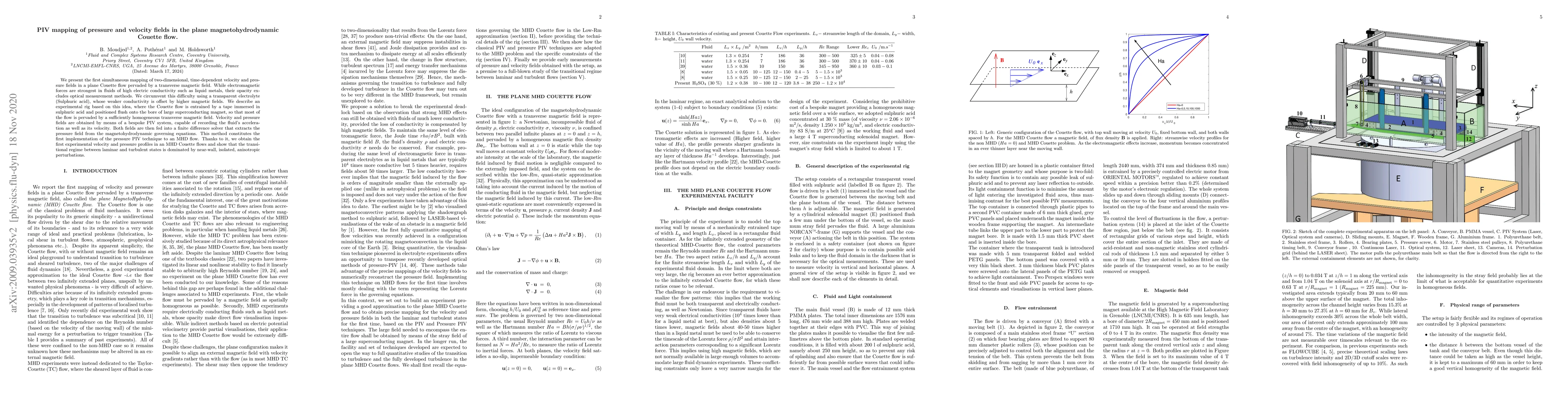 This paper presents the first simultaneous mapping of velocity and pressure fields in a plane magnetohydrodynamic Couette flow using a transparent electrolyte and a bespoke PIV system. The study reveals that transitional regimes in such flows are dominated by near-wall perturbations.